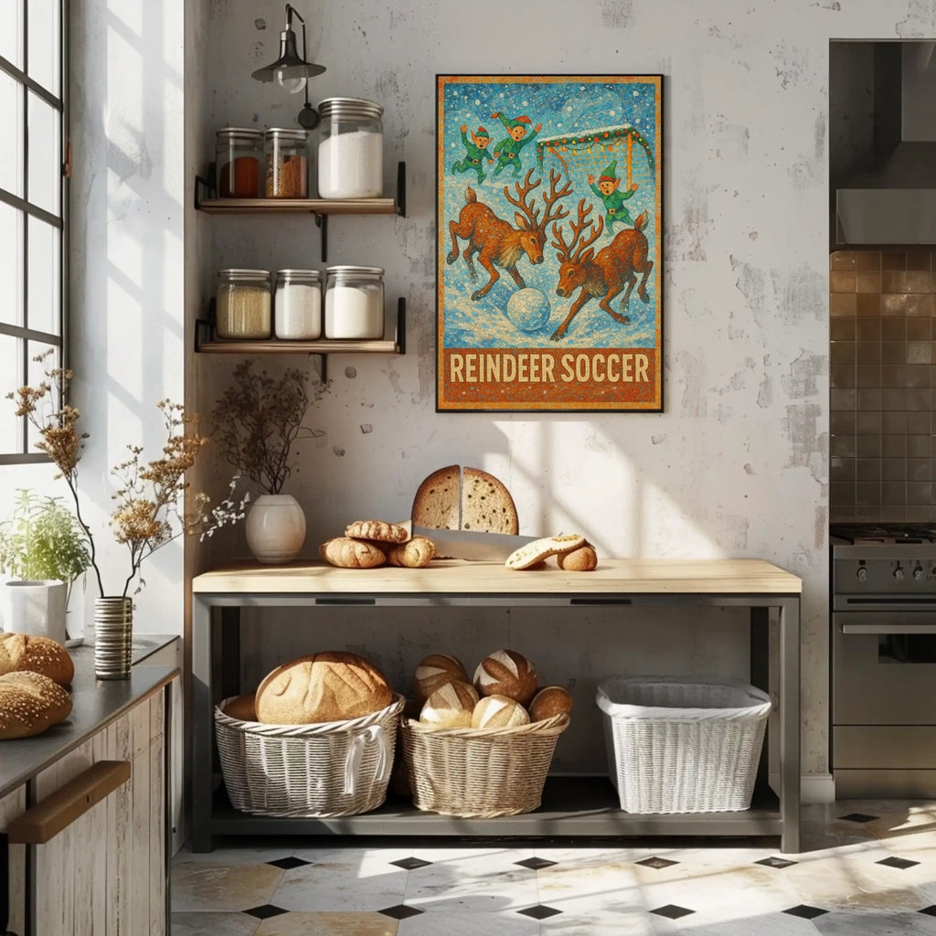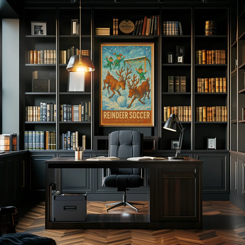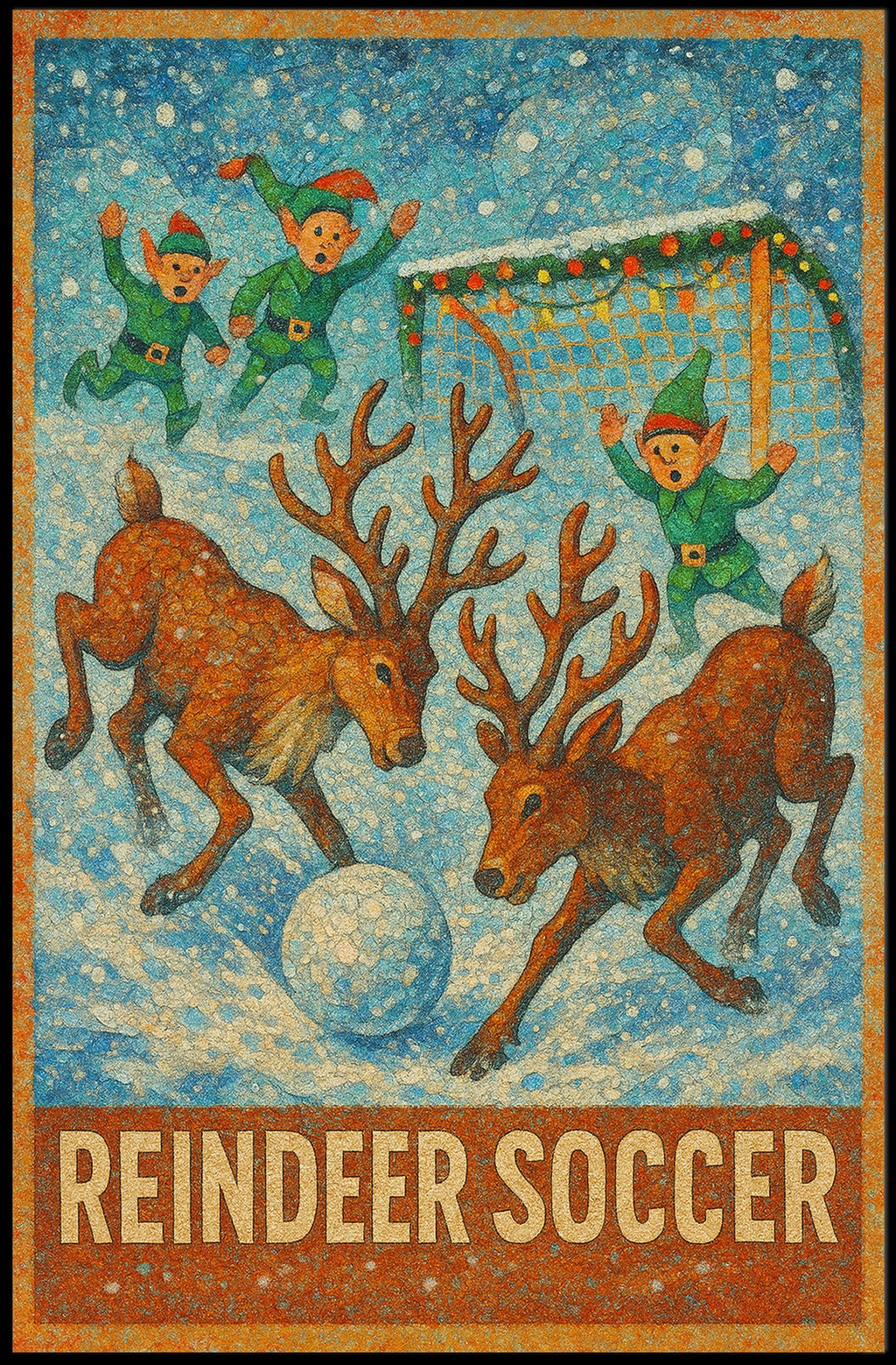 Celebrate the holiday season with this charming poster featuring a whimsical winter scene. Two playful reindeer engage in a lively soccer match amidst a snowy landscape, while three cheerful elves, dressed in festive green and red attire, cheer them on from the sidelines. The illustration captures the nostalgic essence of vintage holiday postcards, with warm tones and intricate details that evoke a sense of joy and celebration. Perfect for adding a touch of humor and festive spirit to any space, this poster is an ideal choice for sports enthusiasts and holiday lovers alike.