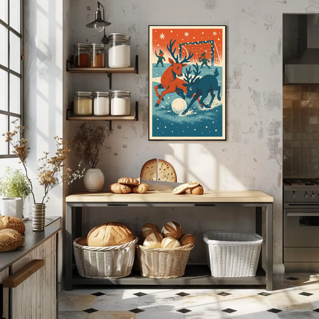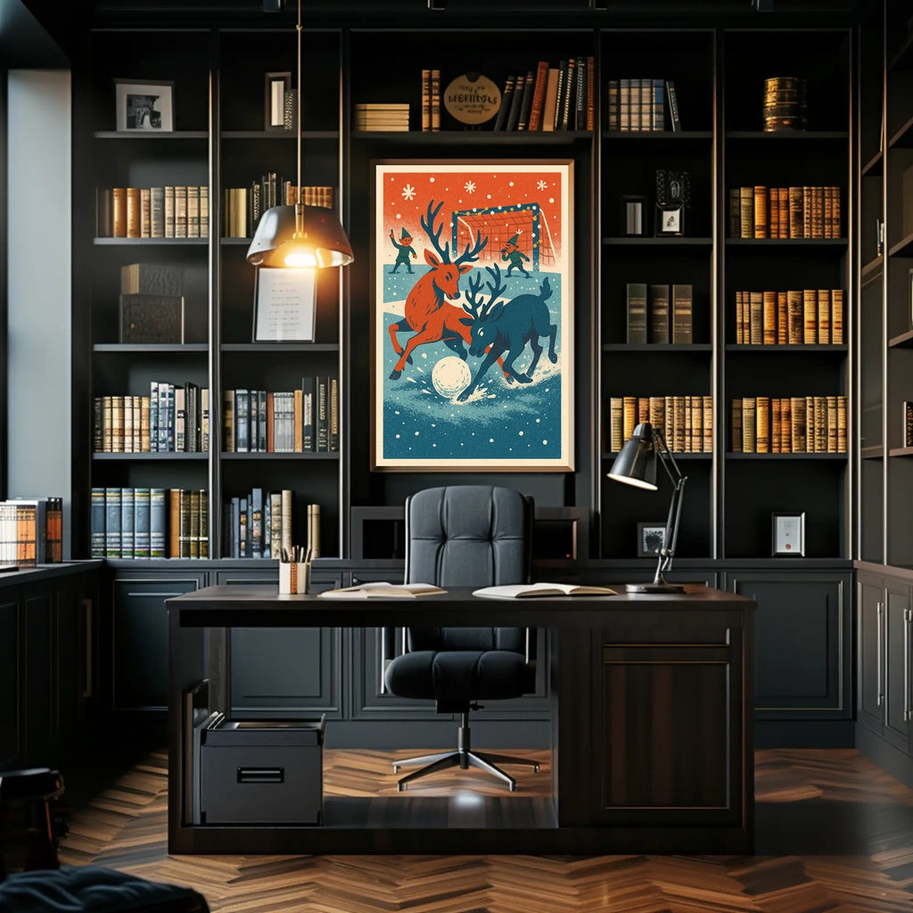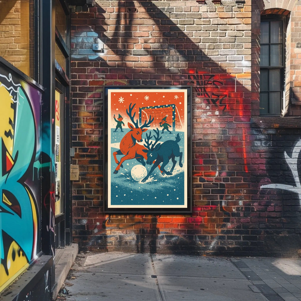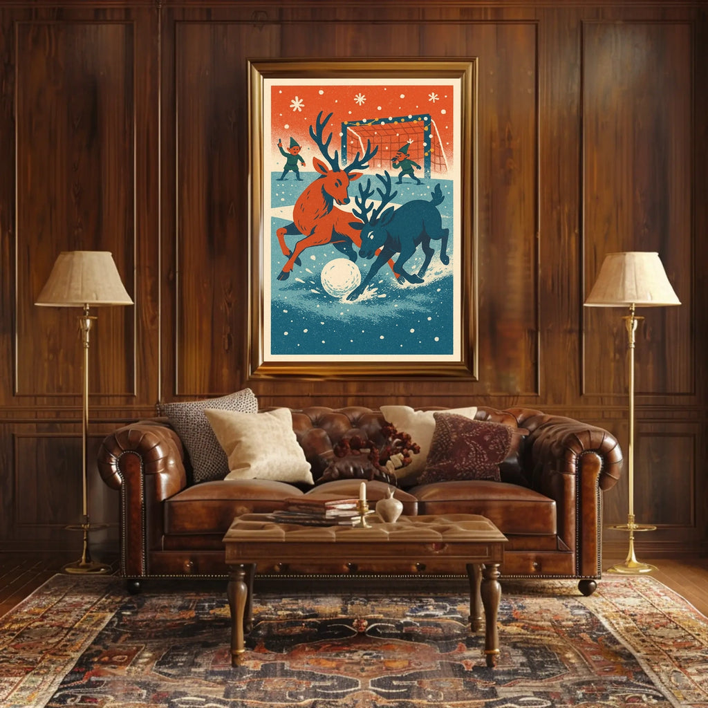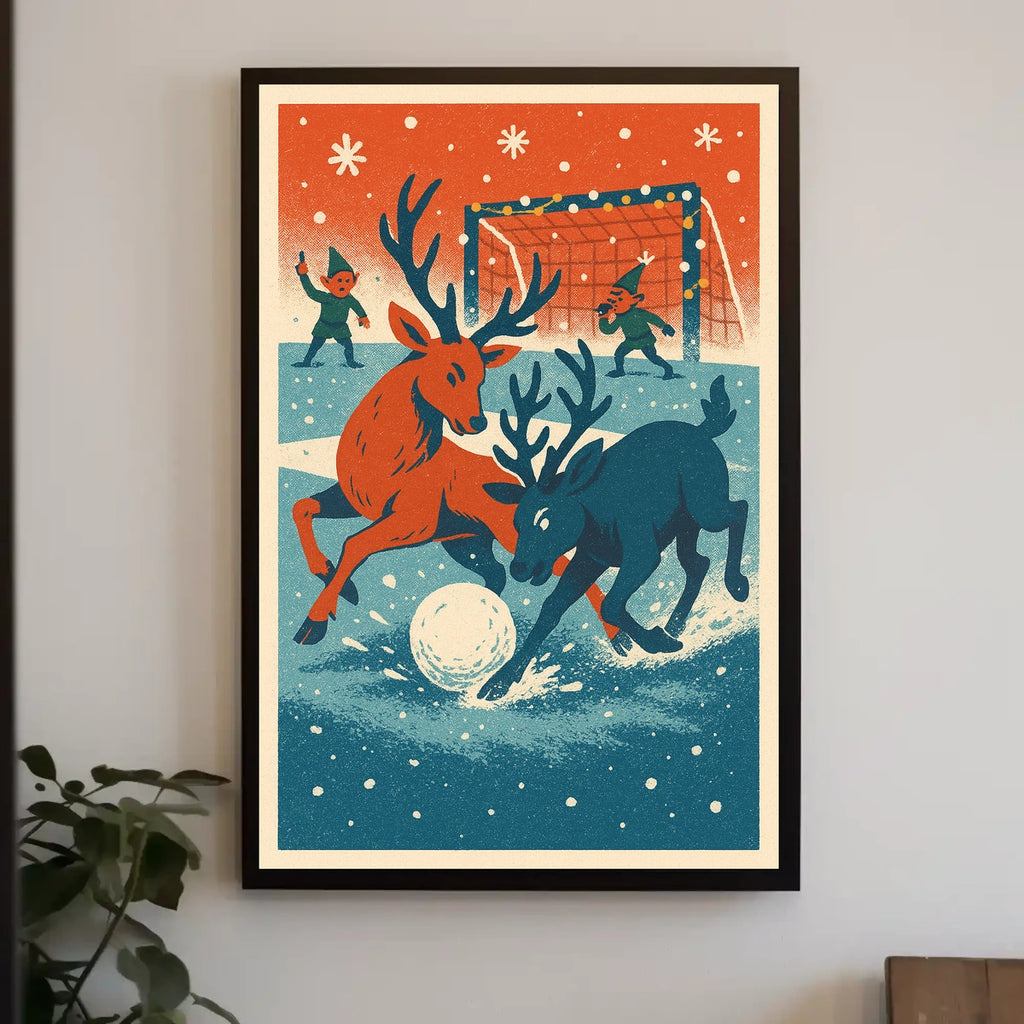 Step into a whimsical winter wonderland with this enchanting poster, capturing the playful spirit of reindeer engaged in a delightful snow-covered sports game. Two lively reindeer chase a giant snowball, reminiscent of soccer or hockey, while two elves in green officiate the match. The scene is set against a backdrop of falling snowflakes and a goalpost adorned with festive string lights. Rendered in a vintage, retro style with a nostalgic color palette of red, blue, and cream, this artwork evokes the charm of mid-20th-century illustrations. Perfect for adding a touch of festive cheer to any space.