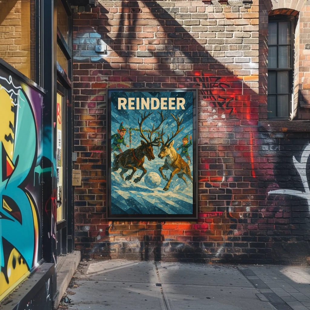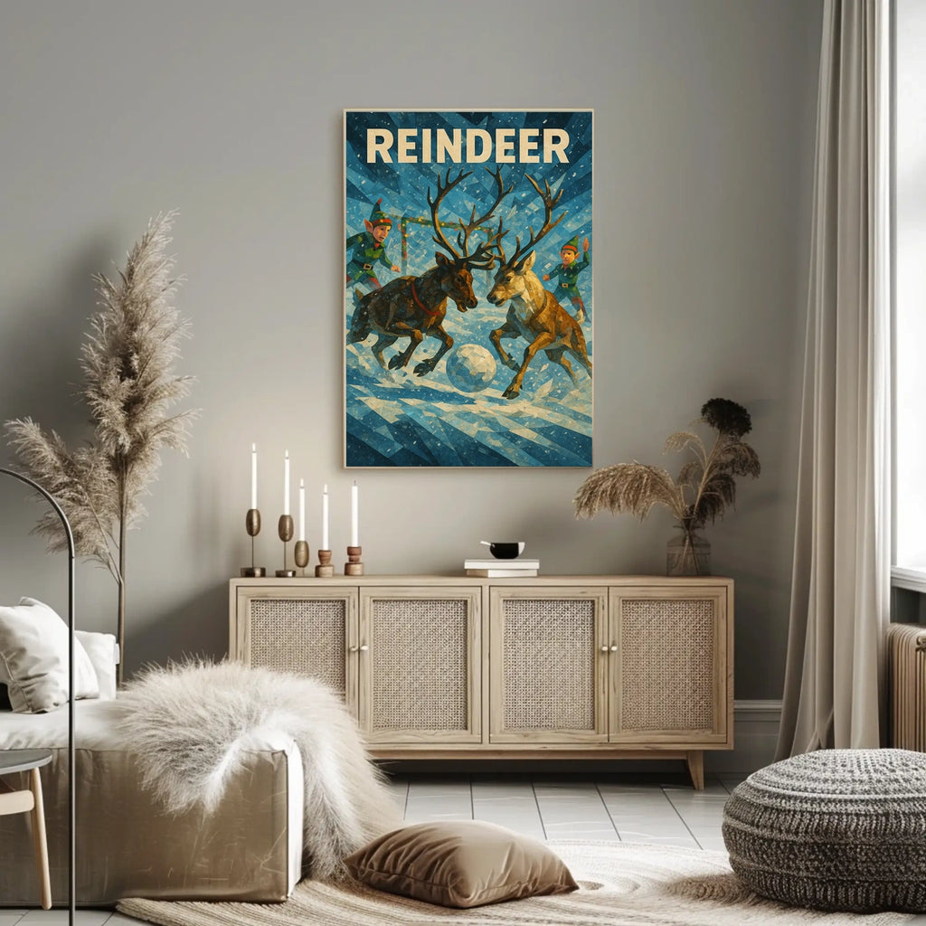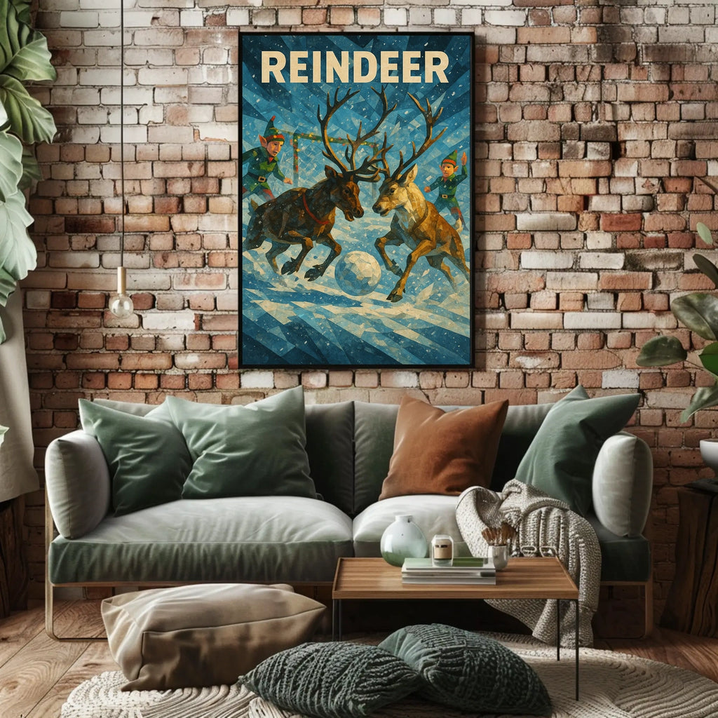 Transform your décor with a snowy North Pole landscape featuring two lively reindeer in a playful snowball game, cheerful elves, and a twinkling light garland. The polygonal, low-poly style adds a modern twist while celebrating Christmas folklore and winter celebrations.