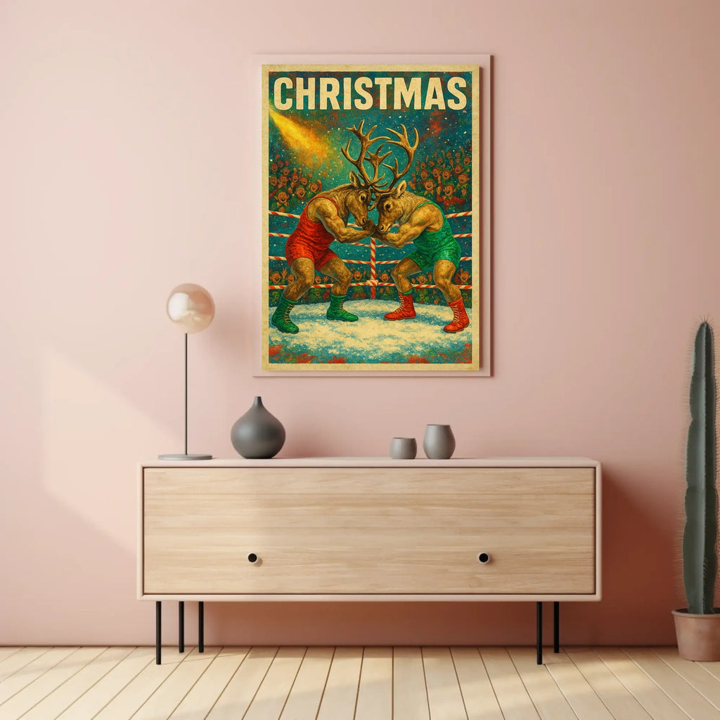 Whimsical Reindeer Wrestling Christmas Fantasy or Mythology Poster celebrates the whimsical charm of the season with a delightful wall art piece that blends humor and holiday magic. This unique scene features two anthropomorphic reindeer in vibrant red and green wrestling outfits, facing off in a festively decorated ring with candy cane-striped ropes, while a spirited crowd cheers. The multicolored, snowy backdrop and classic holiday postcard vibes create a nostalgic, surreal twist on traditional Christmas imagery—perfect for collectors, enthusiasts, or anyone looking to add meaning and inspiration to their space.