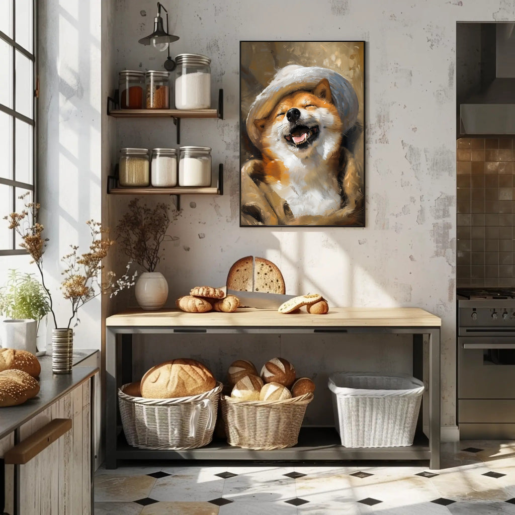 This enchanting poster captures a whimsical digital painting of a cheerful Shiba Inu, adorned with a charming white wide-brimmed hat. Its eyes close in elation, with an open-mouth expression evoking pure delight. The vibrant background, an abstract blend of earthy tones, harmonizes with the dog's fur, creating an inviting warmth. Rendered in an impressionistic style, bold, expressive brushstrokes convey a sense of texture and movement, encapsulating a lighthearted and playful mood. This art piece is perfect for dog lovers and art enthusiasts alike, offering a delightful touch to any space.