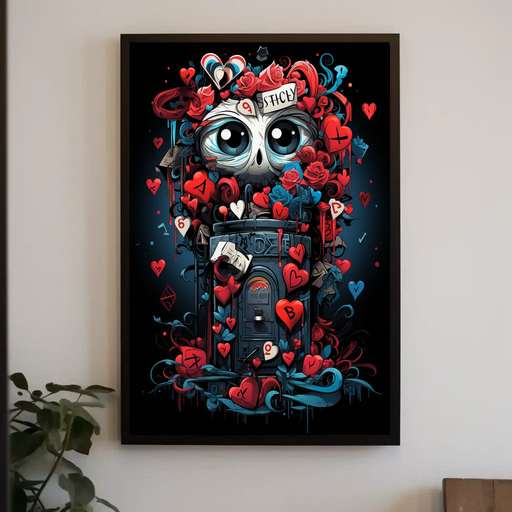 Dive into a world of surreal romance with this captivating poster, featuring a stylized skull with large, expressive eyes at its heart. Surrounded by vibrant red and blue hearts and roses, the design creates a striking contrast against a dark backdrop. Symbols and letters interwoven among the hearts add an air of mystery, while an old-fashioned mailbox hints at secrets and communication. The modern artistic style, infused with romantic surrealism, employs swirling tendrils and dripping effects to evoke an ethereal, dreamlike quality. Perfect for lovers of surreal art, this dynamic piece is ideal for Valentine's or love-themed decor.