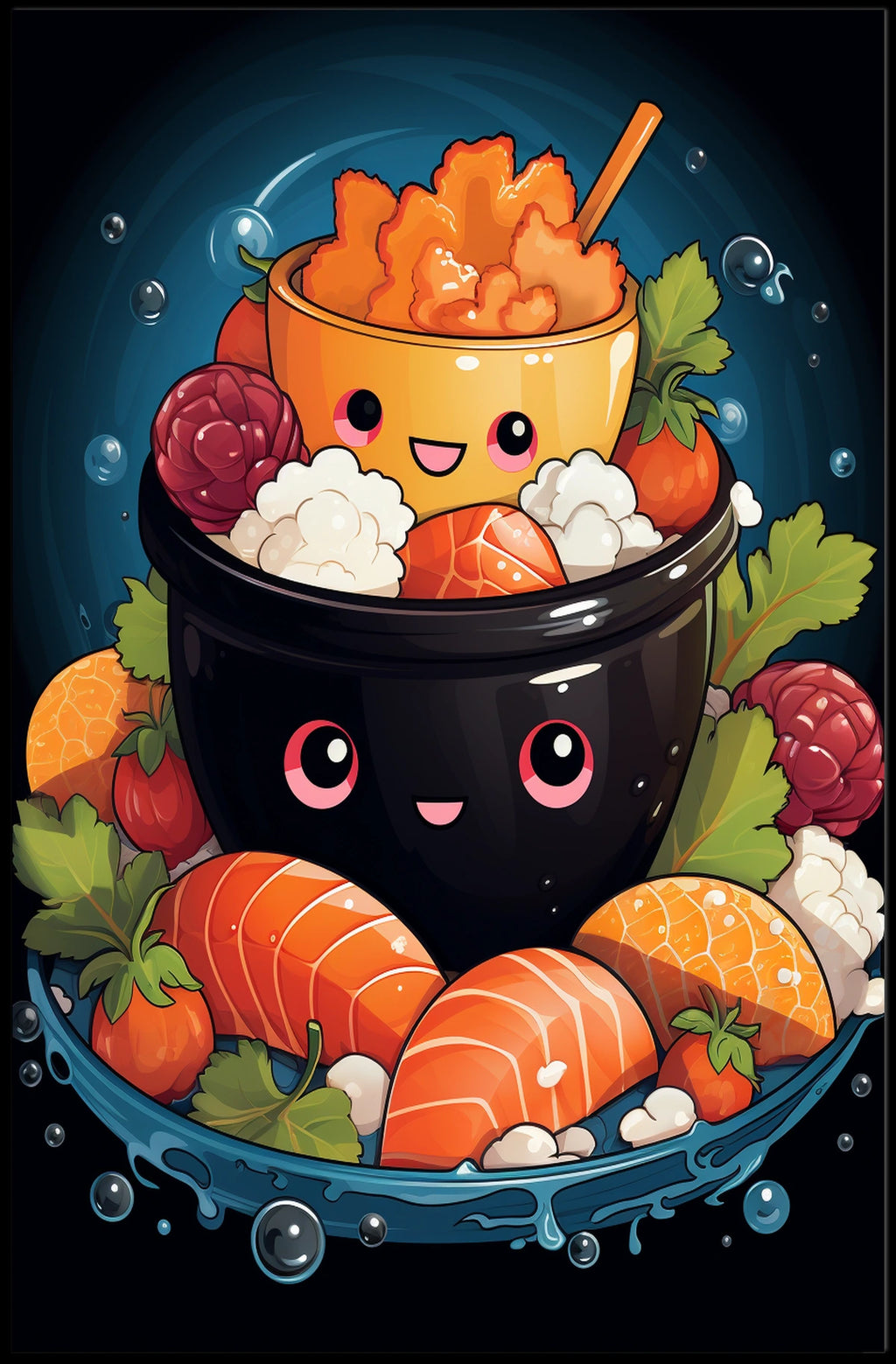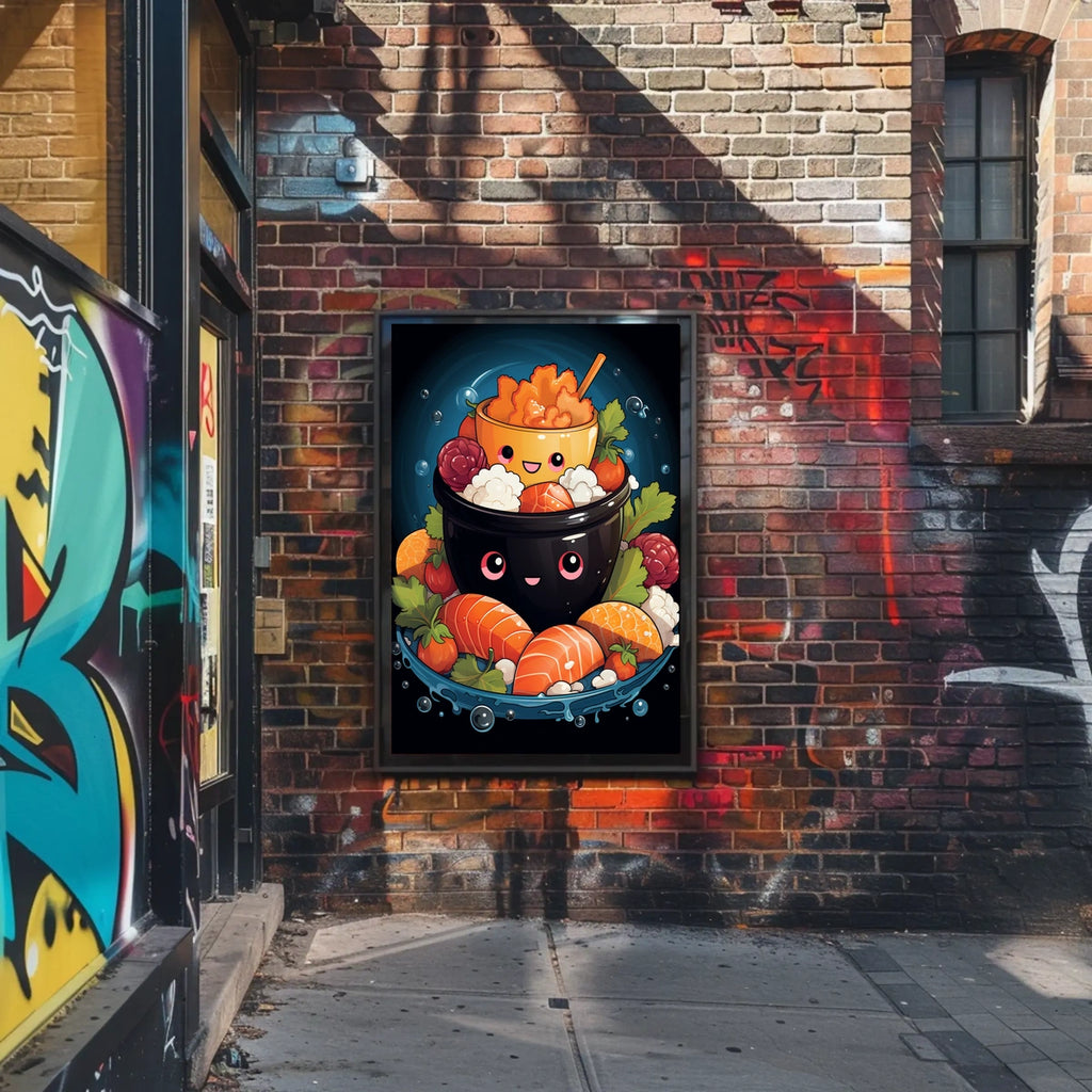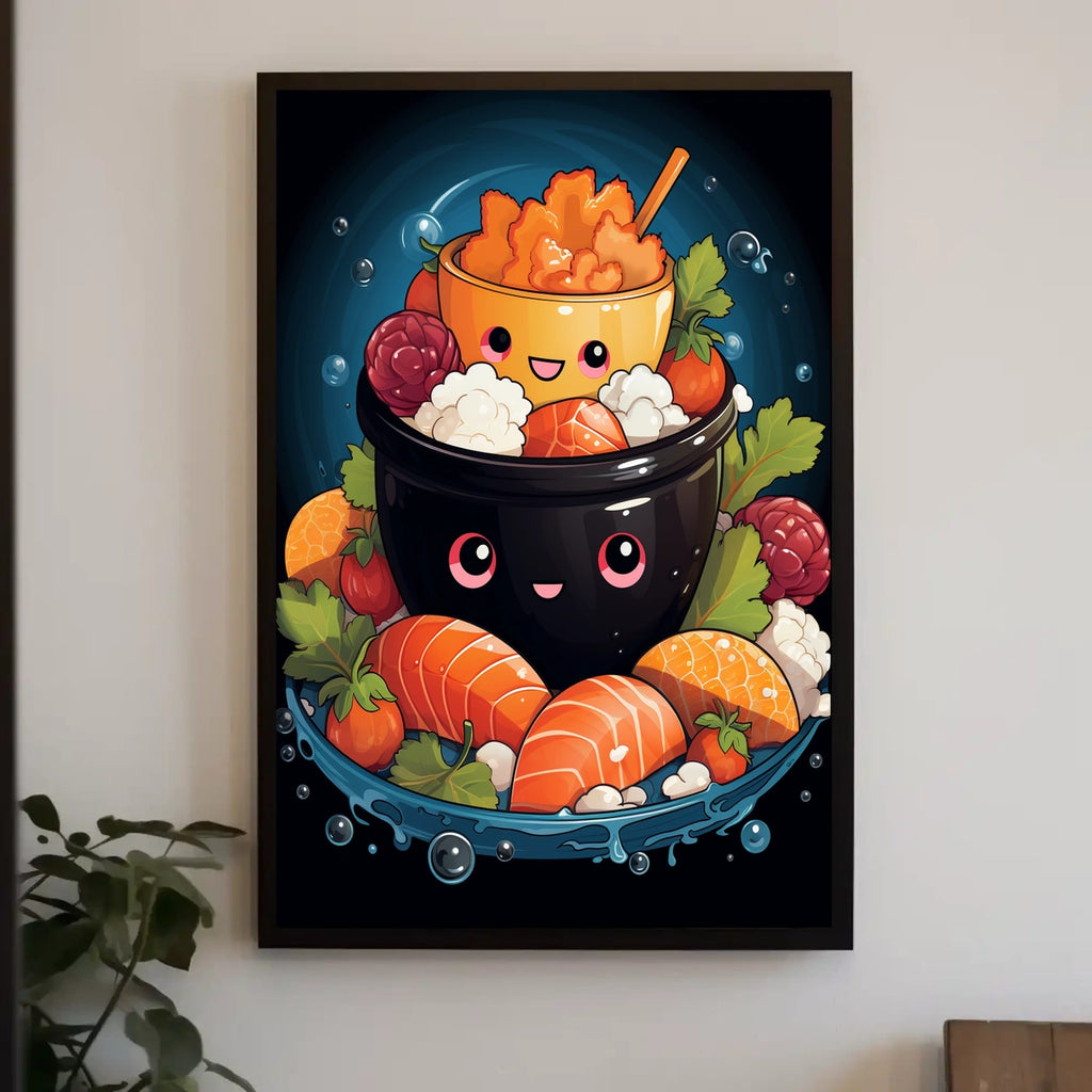 Add a splash of joy to your space with this vibrant and whimsical illustration poster. The artwork features a stack of smiley-faced bowls, artistically filled with a variety of foods, fostering a playful and uplifting atmosphere. Each bowl adds a unique layer, with the top bowl capturing attention with its bright selection of snacks. This colorful, cartoonish design is perfect for those who appreciate art with a light-hearted touch. Boost your decor with this cheerful piece, suitable for kitchens, dining areas, or children's rooms. Let your walls grin with charm.