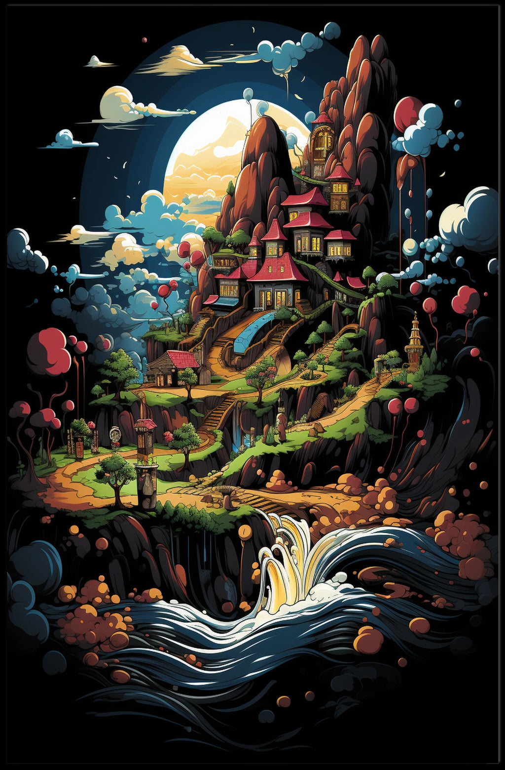 - Detailed design highlighting a whimsical village with red-roofed houses nestled among majestic rocky cliffs, an enchanting waterfall cascading into a swirling river
