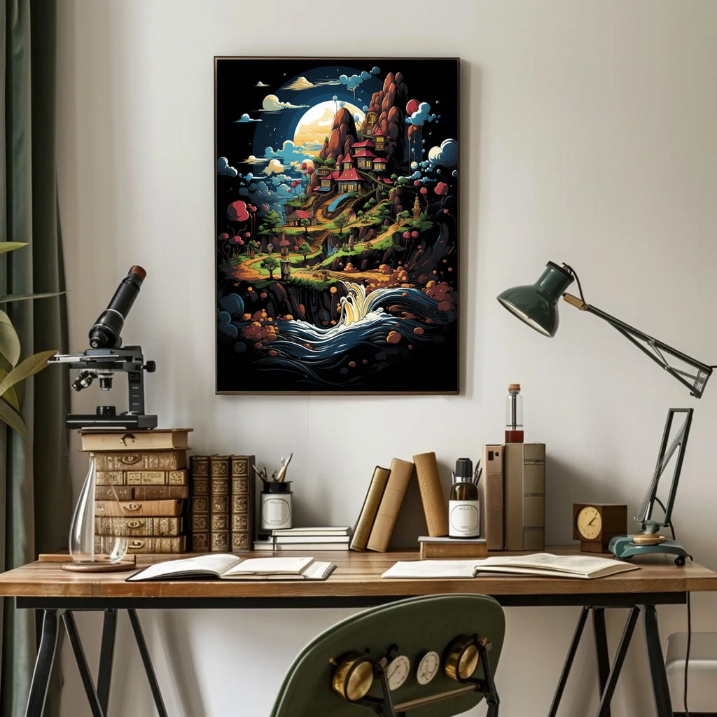 Printed with precision and made to inspire, this artwork is more than decoration—it’s a conversation piece that connects fantasy, nature, and imagination. Bring Whimsical Village Fantasy Landscape Art Poster into your home, classroom, or office today and let your walls tell a powerful story.