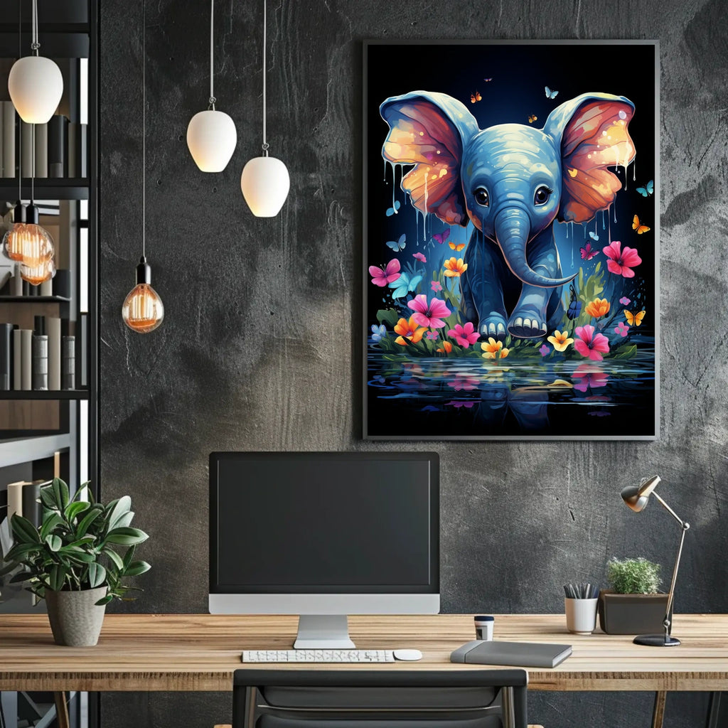 Step into a magical realm with Whimsical Wilderness, where a playful elephant calf frolics among vibrant flowers and fluttering butterflies. This enchanting artwork captures nature's beauty and the carefree wonder of childhood, bringing a splash of whimsy to any space.