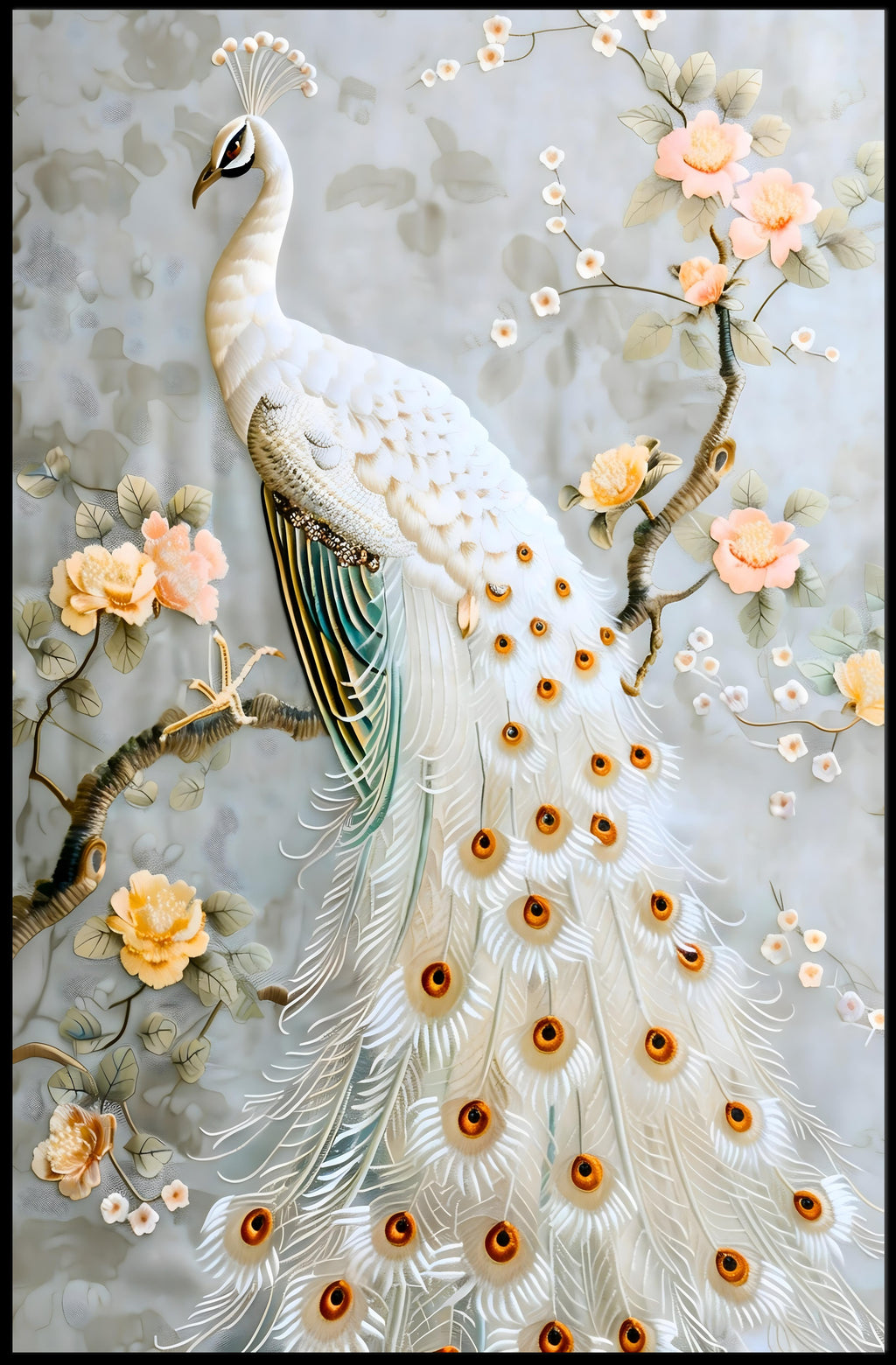 Elevate your interior with the White Peacock Elegance Cultural or Heritage Poster — a serene fusion of East Asian artistry and minimalist vintage charm. This PosterGoat original captures a majestic white peacock perched on a flowering branch, its cascading tail feathers rendered with intricate eye motifs, soft pastel florals, and subtle gold accents that bring refined depth to any wall.