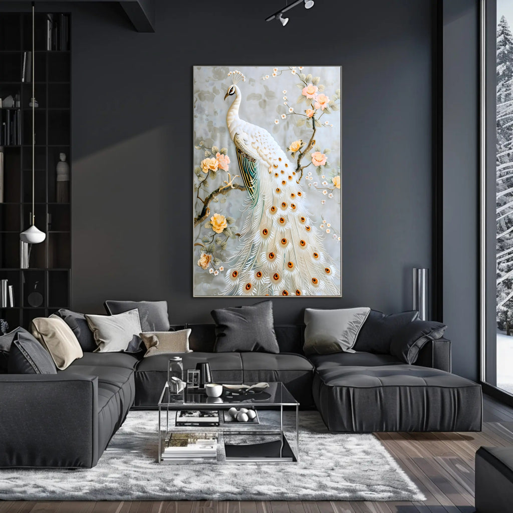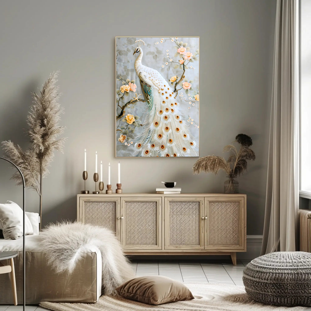 This poster brings the soothing balance of cultural artistry to modern spaces: the soft grey background and blush florals create a tranquil atmosphere while the intricately detailed white peacock adds sophistication and symbolic grace. Whether you’re curating a feature wall or searching for the perfect finishing touch, this print makes a memorable statement without overwhelming your décor.