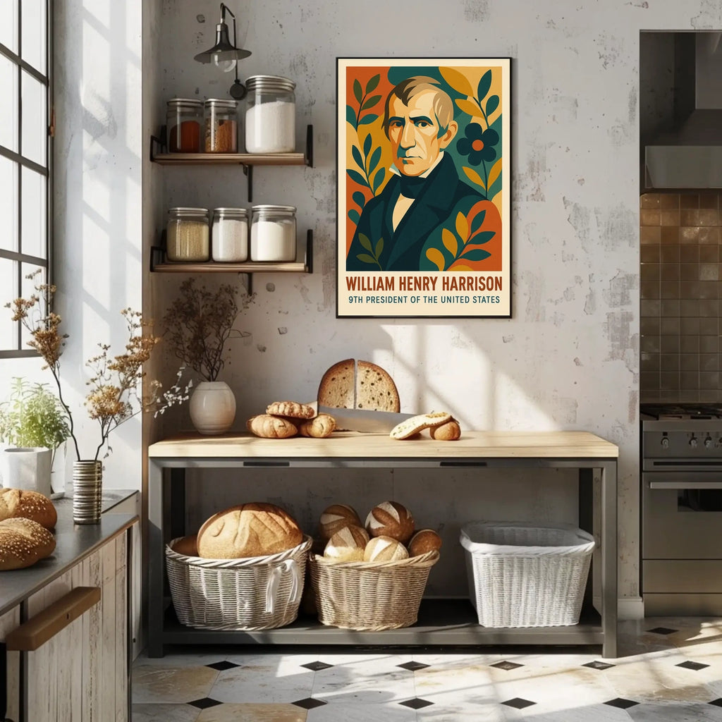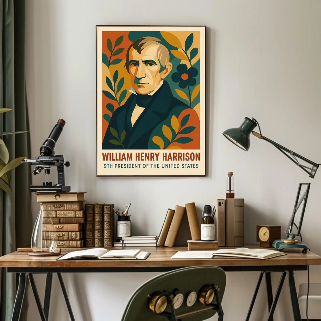 William Henry Harrison Vintage Patriotic Art Poster celebrates the legacy of the 9th President of the United States with a vintage-inspired design. This portrait poster features Harrison's dignified likeness, enriched by stylized plant motifs and abstract shapes for a distinctive decorative touch. Its bold, flat colors and simplified forms create a classic yet modern aesthetic, while earthy tones of orange, green, and blue provide a harmonious palette. Ideal for educational settings or stylish decor, this poster blends historical flair with a formal yet accessible mood.