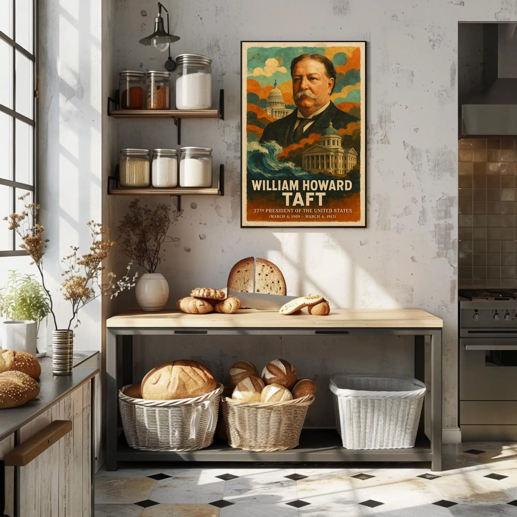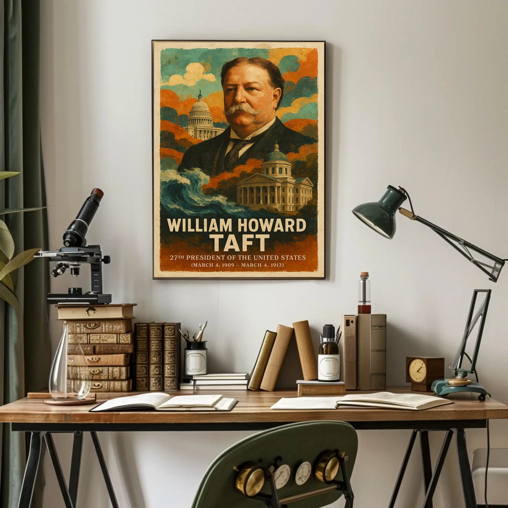 This layered digital collage poster spotlights William Howard Taft, the 27th President of the United States. Blending a vintage political portrait with contemporary collage effects, it's designed for history lovers, educators, and anyone who appreciates thoughtful wall art in their home or office.