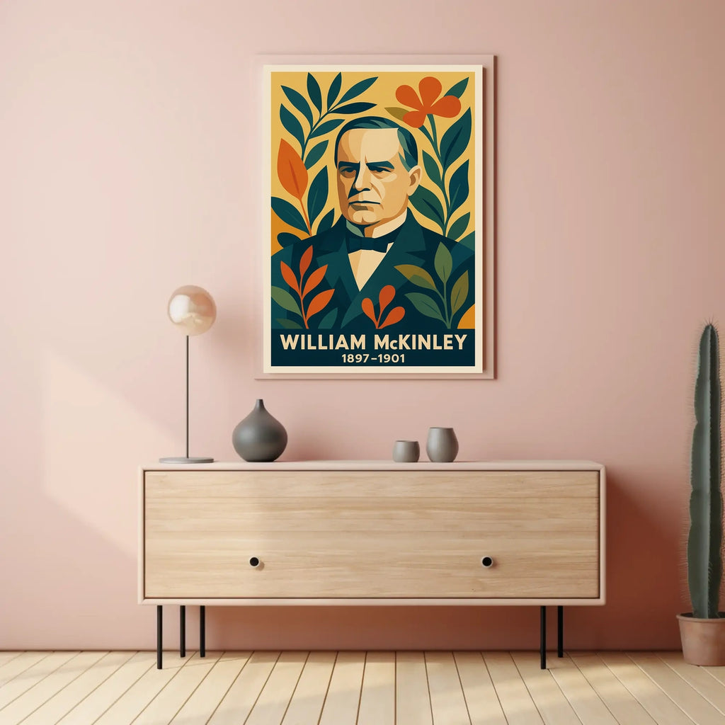 Celebrate American history with this striking poster featuring a stylized portrait of William McKinley, the 25th U.S. president. This artwork blends a vintage theme with a contemporary flat design, using vibrant, bold colors and abstract floral elements to frame McKinley's image. The composition exudes a formal and patriotic mood, perfect for history enthusiasts and art lovers alike. The modern graphic aesthetic adds a unique twist to traditional presidential portraits, making it an ideal addition to any home or office space seeking to evoke respect and retrospection. A standout piece for patriotic wall art and vintage modern art collections.