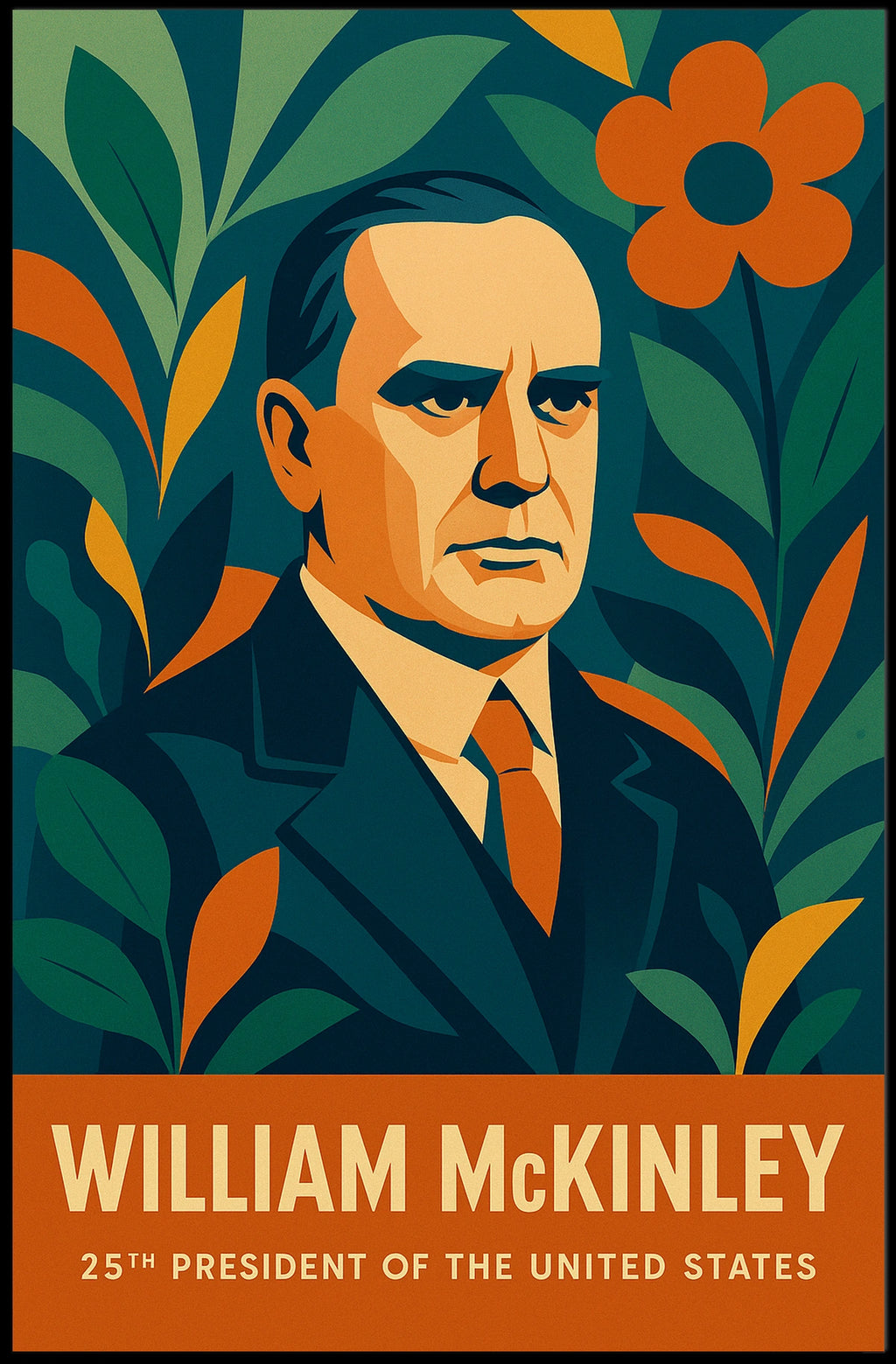 Celebrate American history with this striking poster featuring William McKinley, the 25th President of the United States. This artwork presents a stylized portrait of McKinley, dressed in a classic suit, set against a backdrop of floral and leaf motifs. The vintage graphic style, characterized by bold and flat colors, infuses the piece with a retro charm. The design's patriotic and bold theme is enhanced by its vibrant colors and simplified shapes, making it a perfect addition to any space that appreciates historical significance with a modern twist. Ideal for history buffs and art enthusiasts alike.