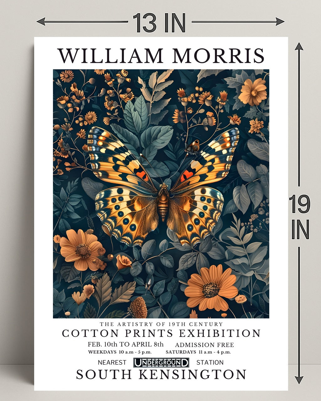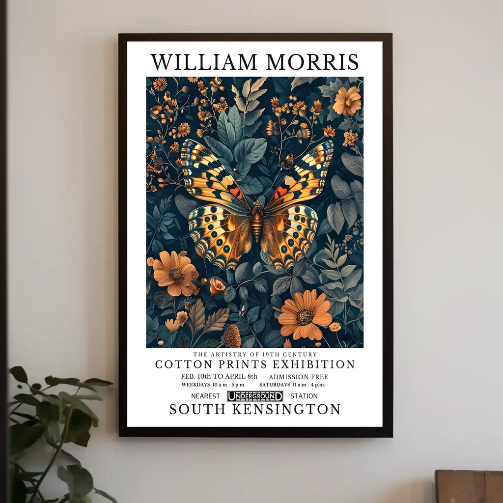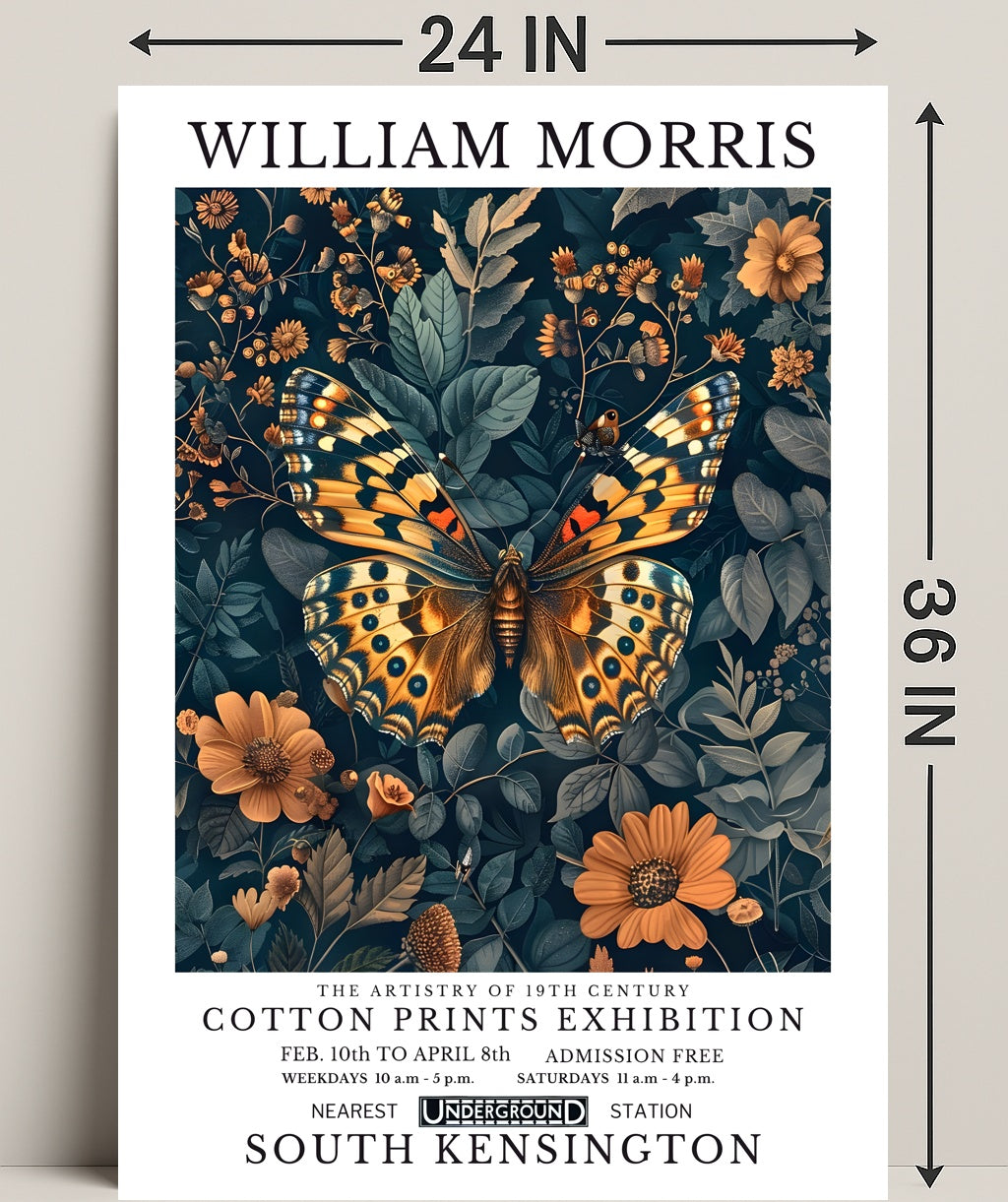 William Morris Exhibition Cotton Prints Cultural or Heritage Poster by PosterGoat brings 19th-century arts & crafts elegance into your home with a richly detailed butterfly illustration set against lush foliage and intricate floral motifs. This striking poster blends vintage design and botanical artistry to create a focal piece that elevates living rooms, studies, galleries, and curated wall displays.