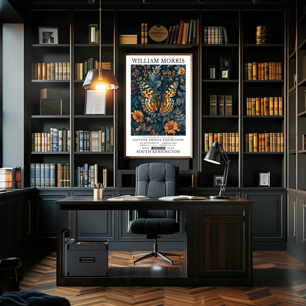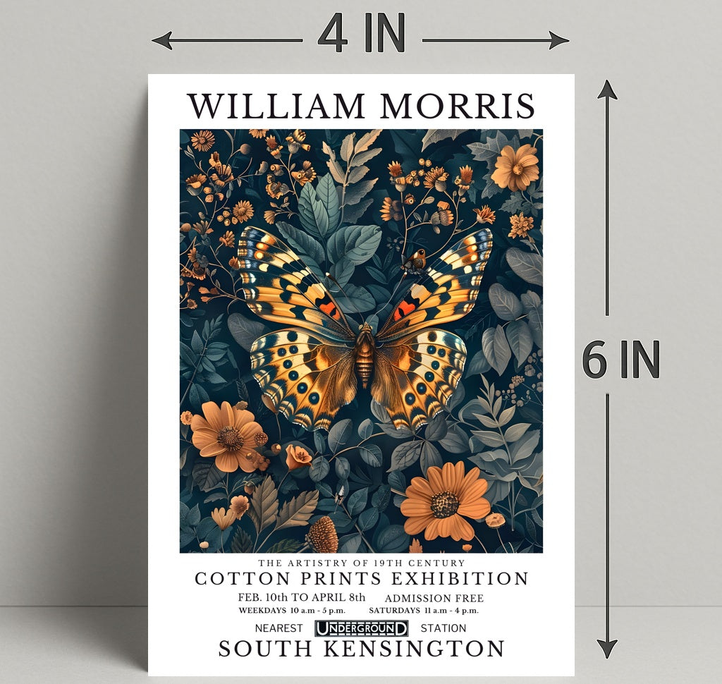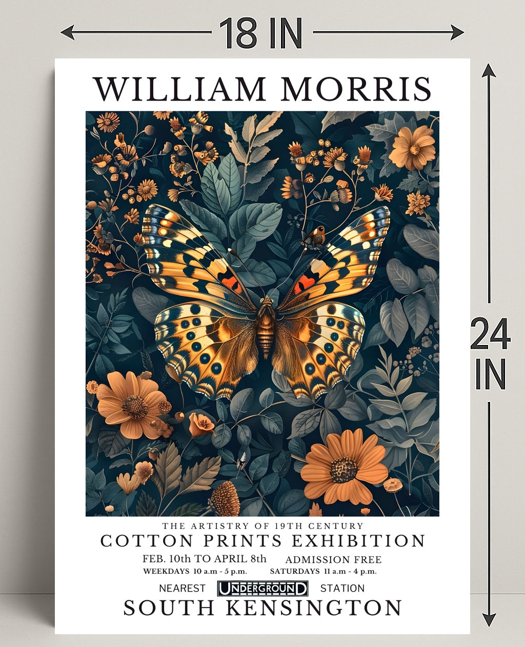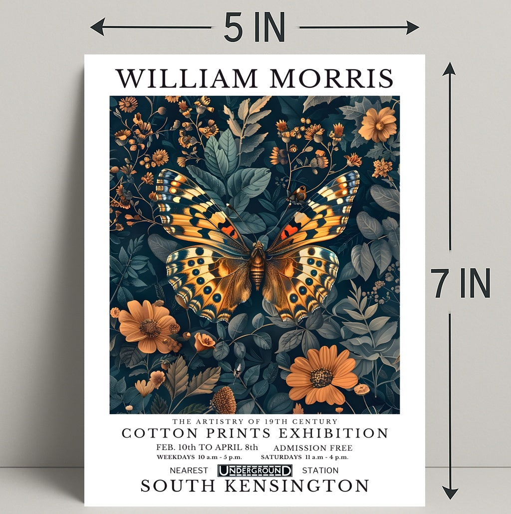 William Morris Exhibition Cotton Prints Cultural or Heritage Poster by PosterGoat brings 19th-century arts & crafts elegance into your home with a richly detailed butterfly illustration set against lush foliage and intricate floral motifs. This striking poster blends vintage design and botanical artistry to create a focal piece that elevates living rooms, studies, galleries, and curated wall displays.