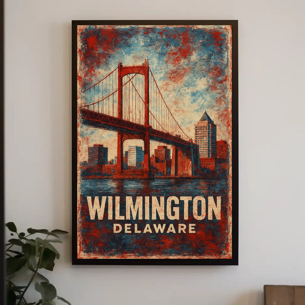 This artistic cityscape poster blends a vintage skyline art style with a modern display, ideal for Delaware travel prints and local heritage art lovers. The warm palette of reds, blues, and creams gives the scene a nostalgic yet bold atmosphere that enhances any room.