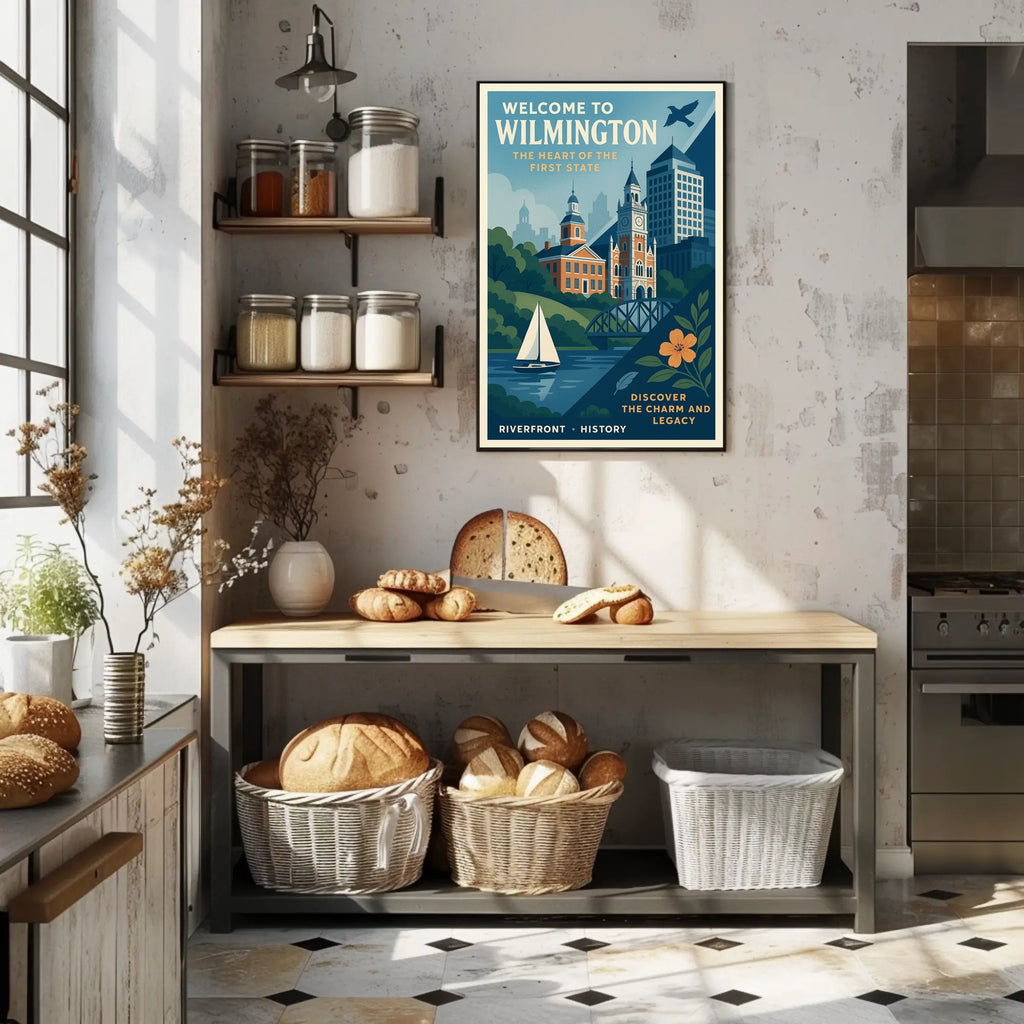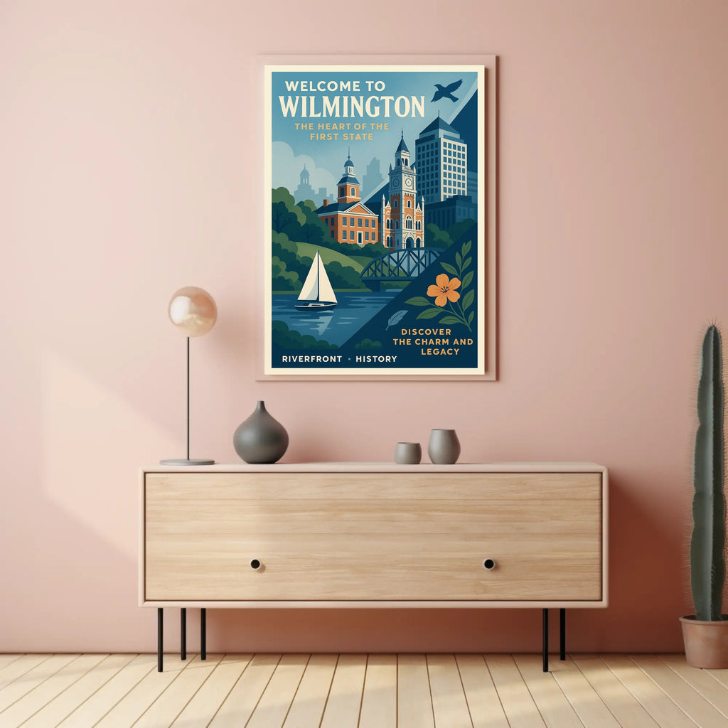 Bring the timeless charm of Wilmington's riverfront into your home. This vintage-inspired urban cityscape poster from PosterGoat celebrates Delaware’s historic architecture, peaceful waterfront, and classic travel-poster style — a perfect focal point for living rooms, offices, or gallery walls.