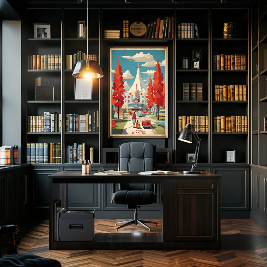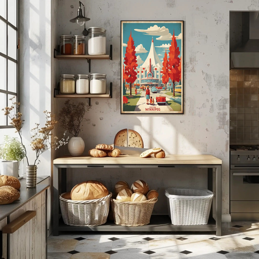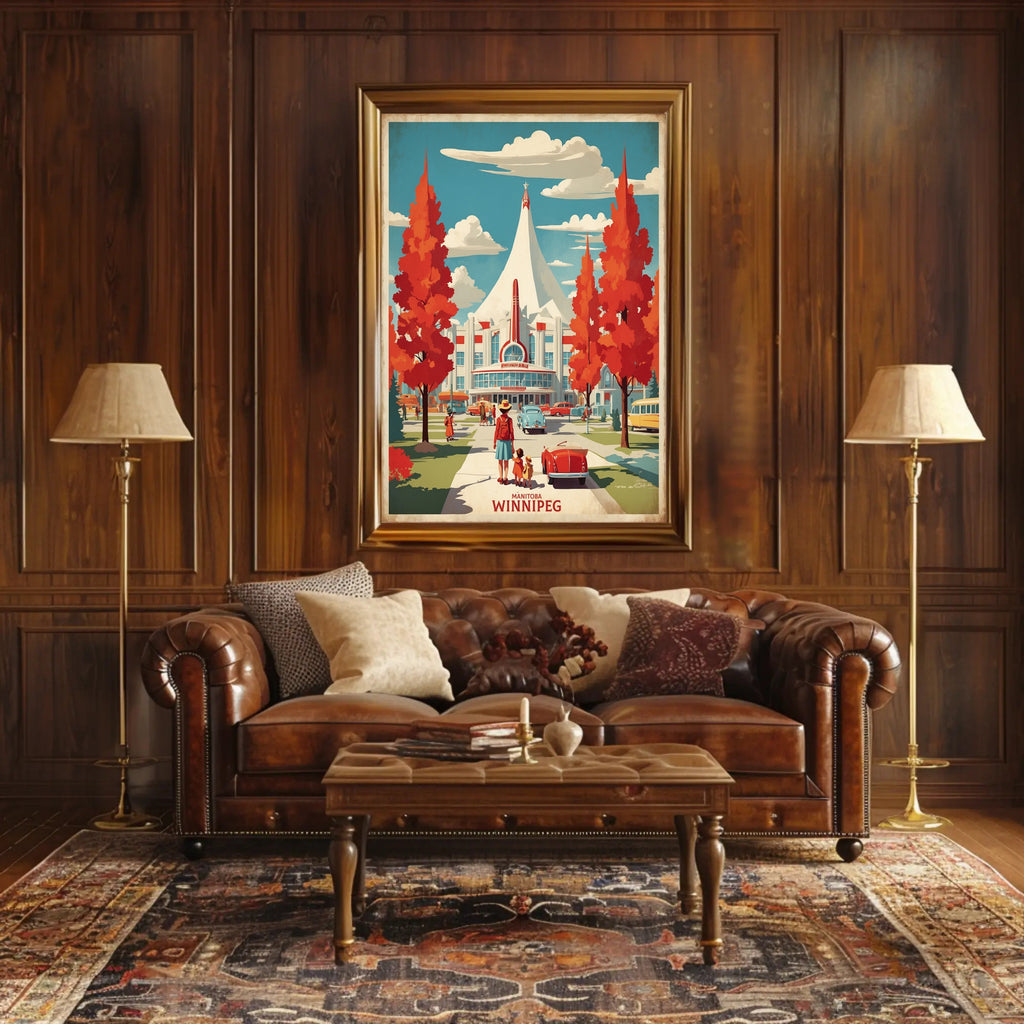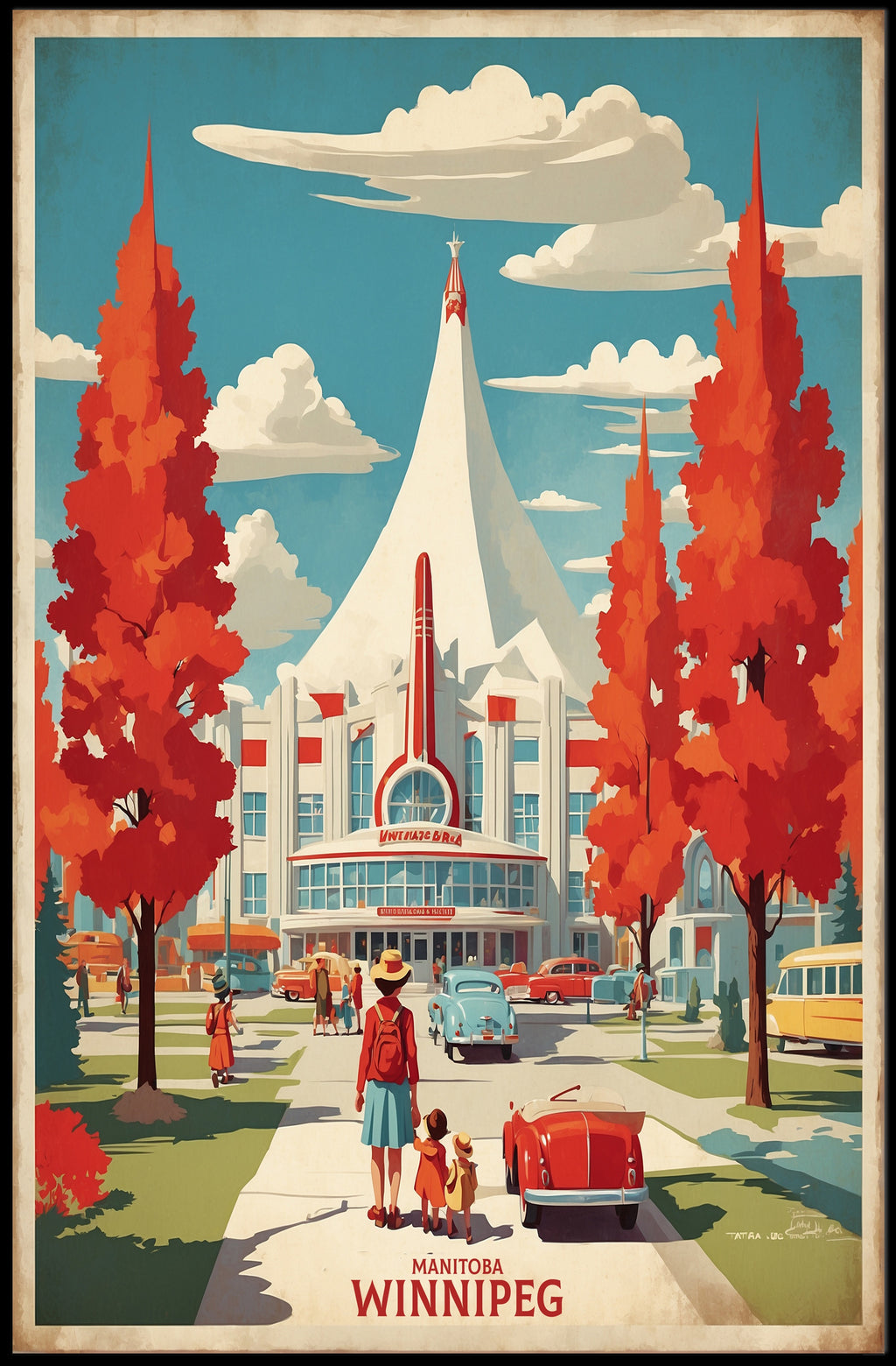 Immerse yourself in a vibrant mid-20th century depiction of Winnipeg, Manitoba, captured in this striking travel poster. The scene conveys an inviting, nostalgic charm with vintage cars and families set against a futuristic architectural marvel. Brilliant autumnal trees and a clear blue sky further enhance its warm, welcoming atmosphere. The artwork blends mid-century modern aesthetics with retro futurism, characterized by clean lines and bold shapes reminiscent of classic 1950s-60s travel advertisements. This piece offers not only a glimpse into historical cityscapes but also a tribute to iconic poster art styles.