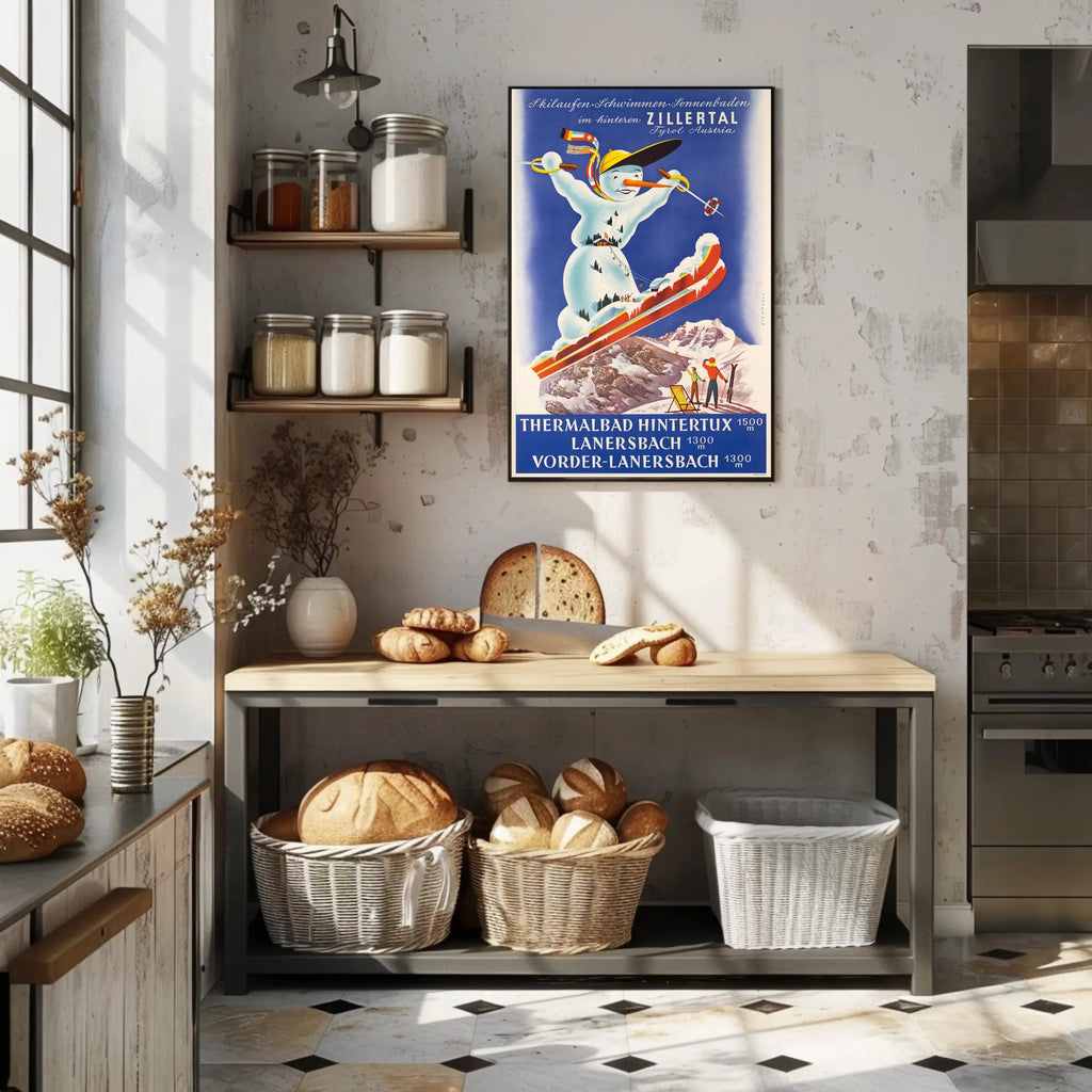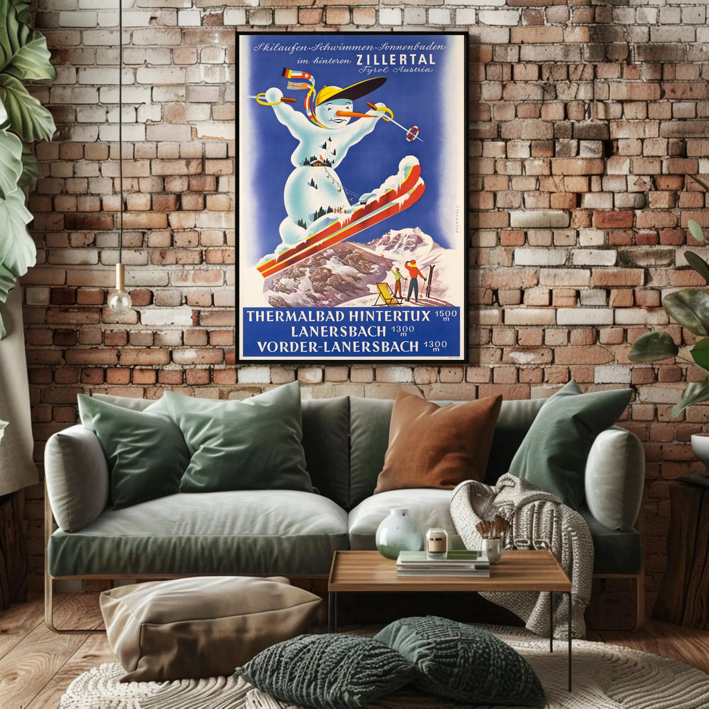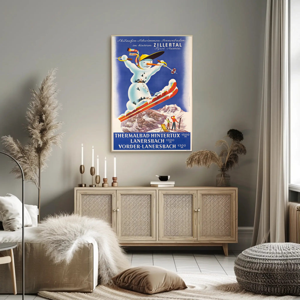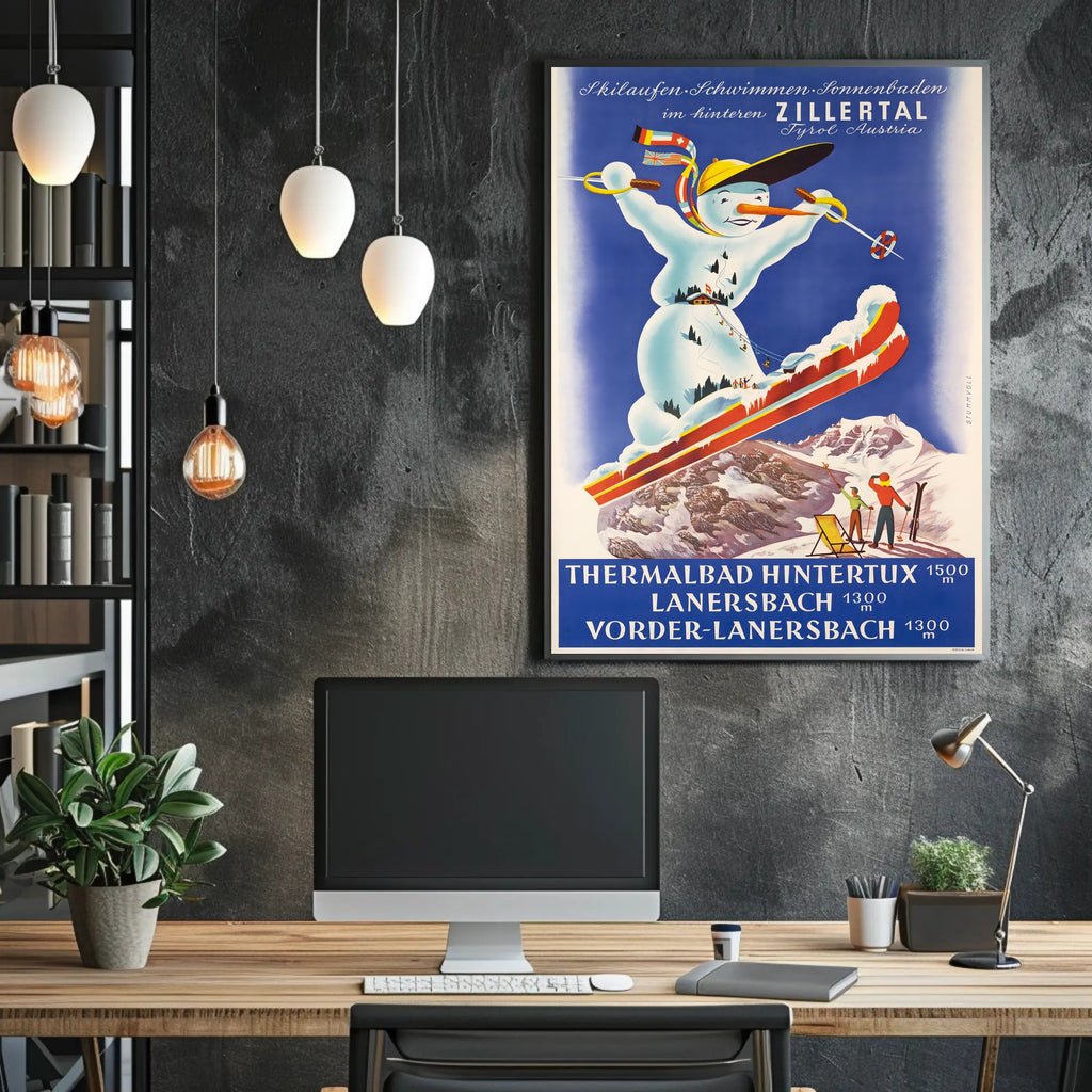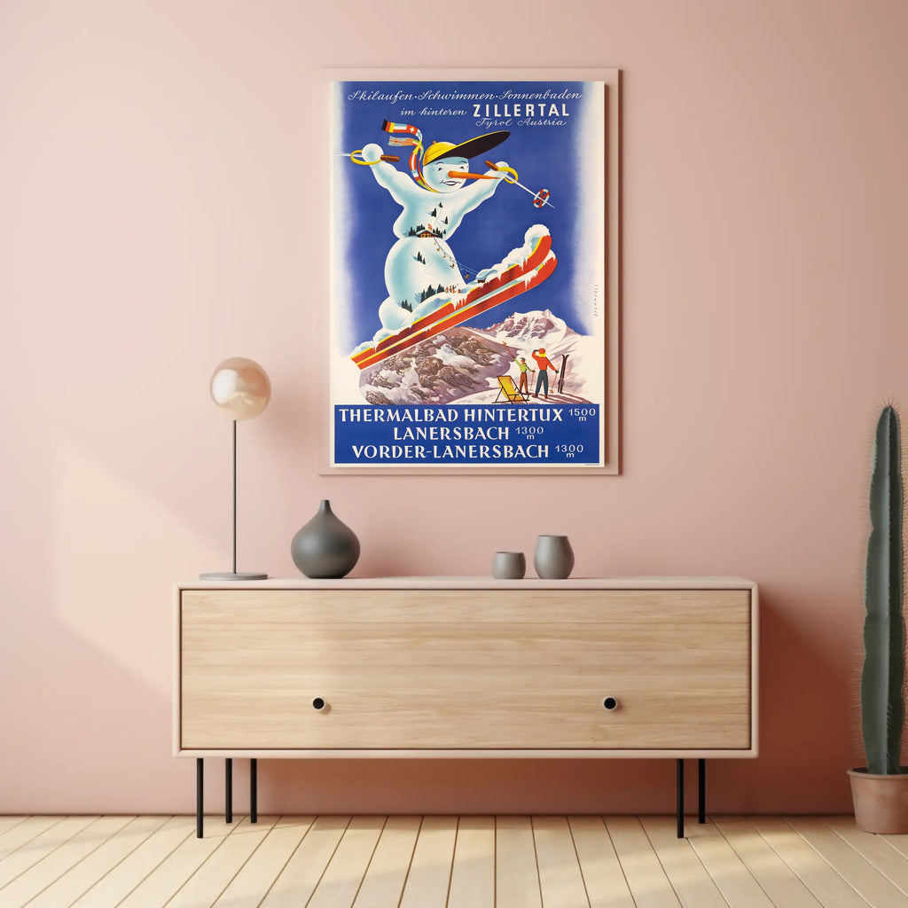Bring alpine adventure into your home with the Winter Activities in Zillertal, Tyrol Poster by PosterGoat — a vintage-inspired travel print that celebrates skiing, mountain leisure and snowy Tyrolean charm.