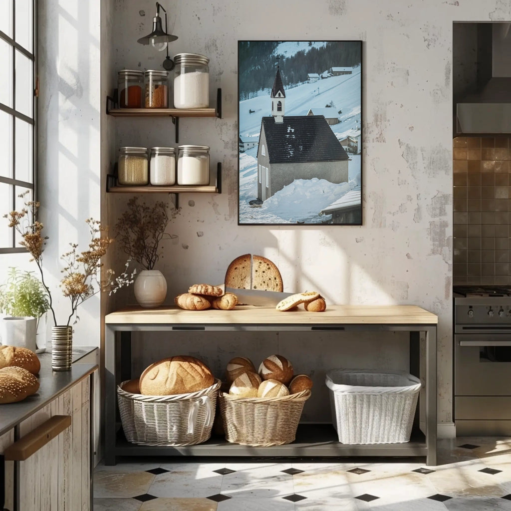 Winter Chapel in the Mountains Poster: Celebrate the beauty of this timeless wall art. Designed to capture its unique appeal, this piece is perfect for collectors, enthusiasts, or anyone who wants to bring meaning and inspiration into their space.