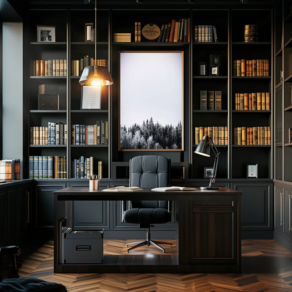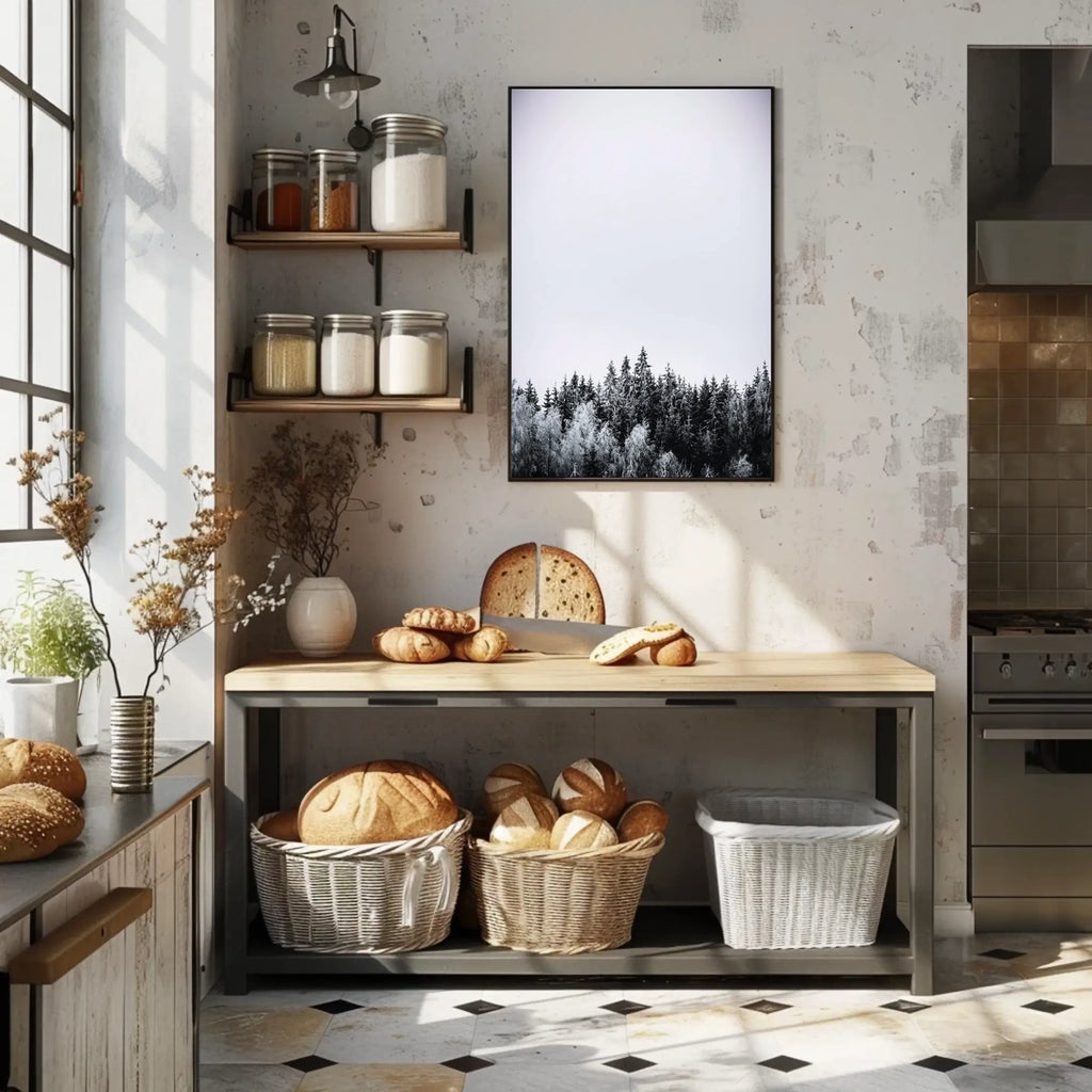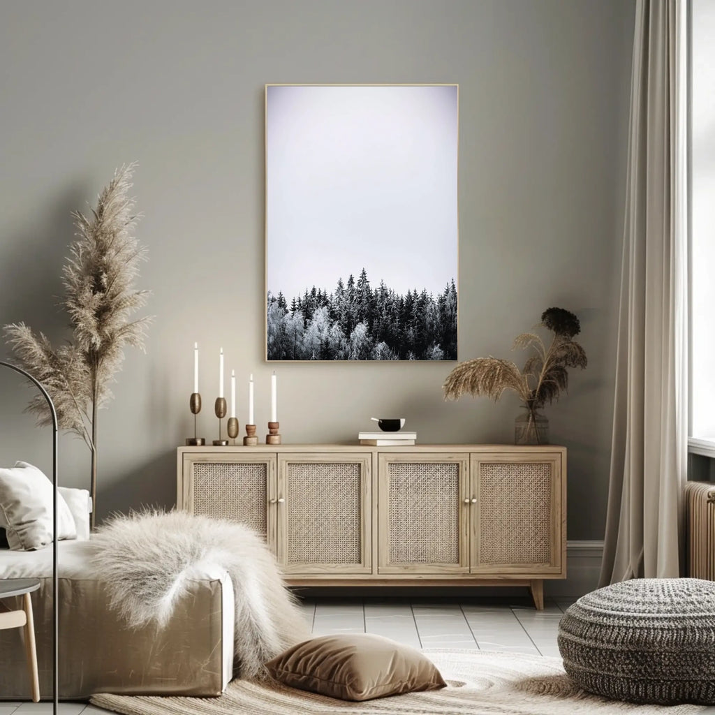 This art print brings the calm of a winter forest into any room, pairing with decor lovers and wanderlust spirits who crave scenic wall art that speaks of nature and serenity.