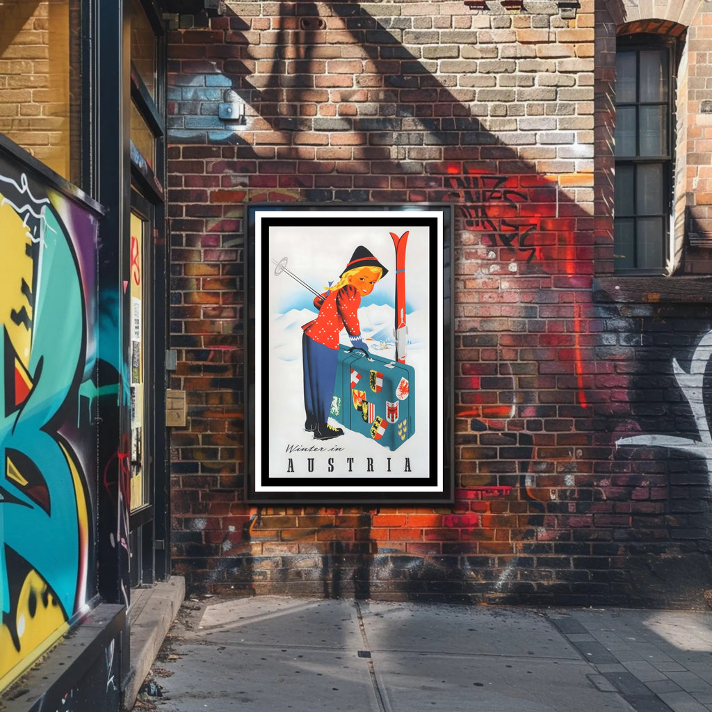 Capture the nostalgia of Alpine holidays with this "Winter in Austria" vintage travel poster from PosterGoat. The cheerful illustration — a smiling child in traditional winter attire leaning on a stickered suitcase beside bright red skis — evokes classic ski-resort charm and timeless travel memorabilia. Printed with vivid colors and crisp detail, this poster brings a retro, playful focal point to any room.
