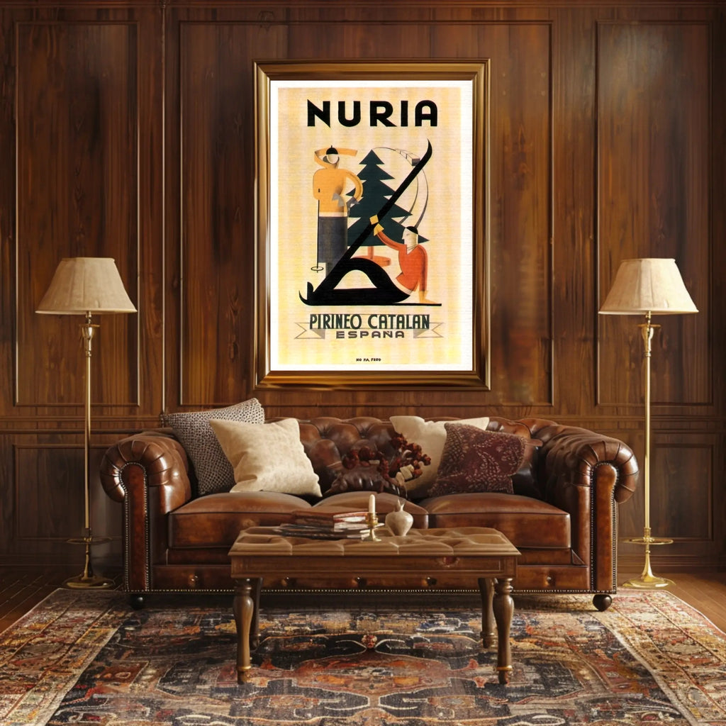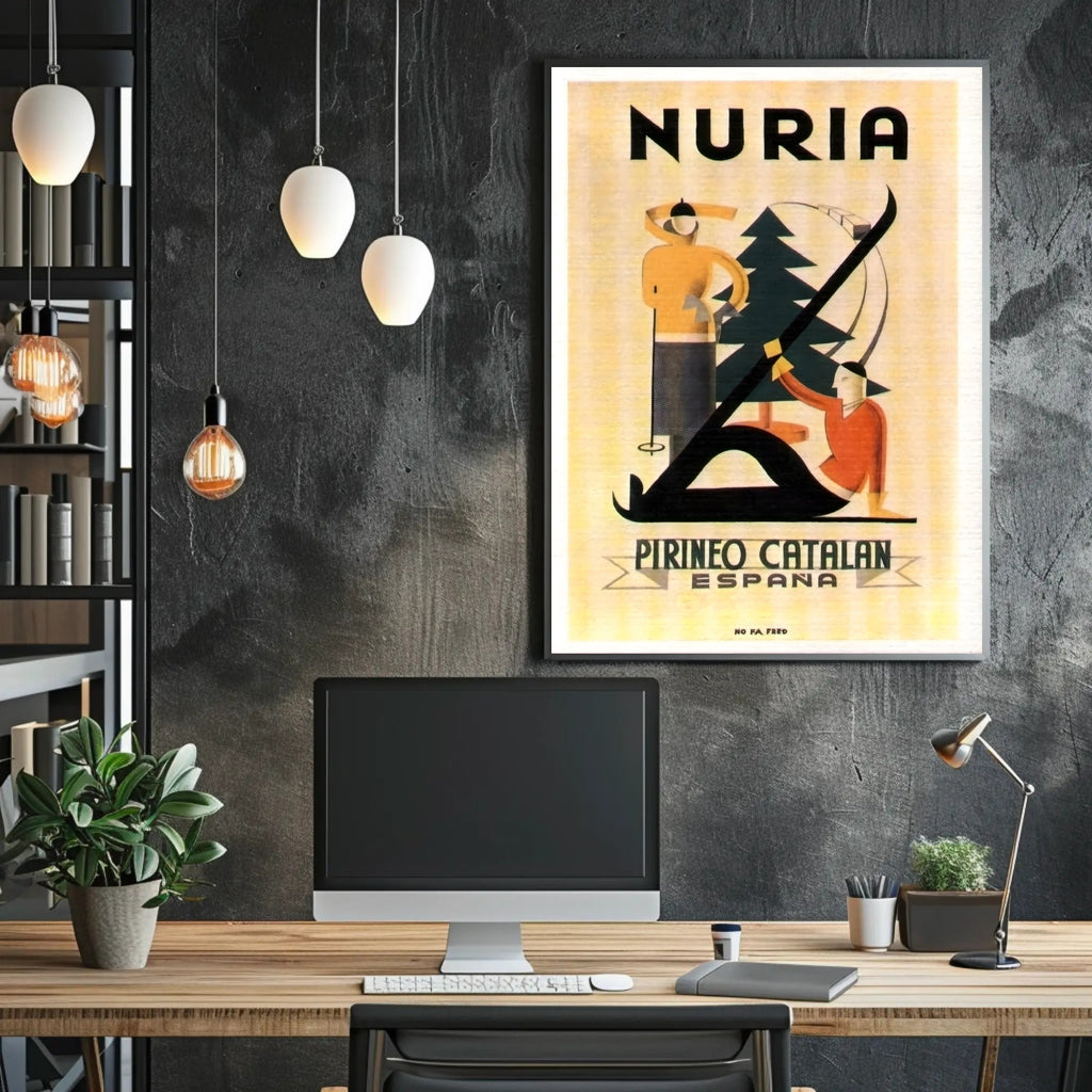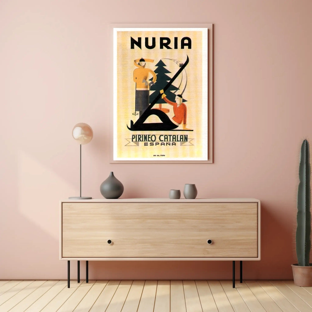 This art print features bold, geometric figures, a stylized pine tree and a dramatic diagonal ski motif set against a warm, softly textured background—evoking classic 20th-century poster design. Large, striking lettering reading “NURIA” and “PIRINEO CATALAN · ESPAÑA” anchors the composition, making it an eye-catching focal point for any wall.
