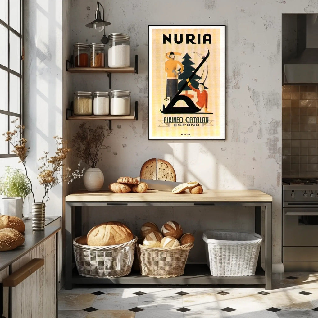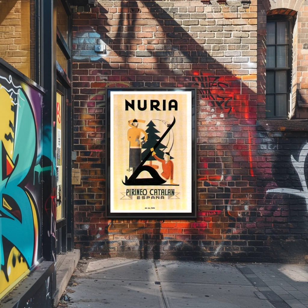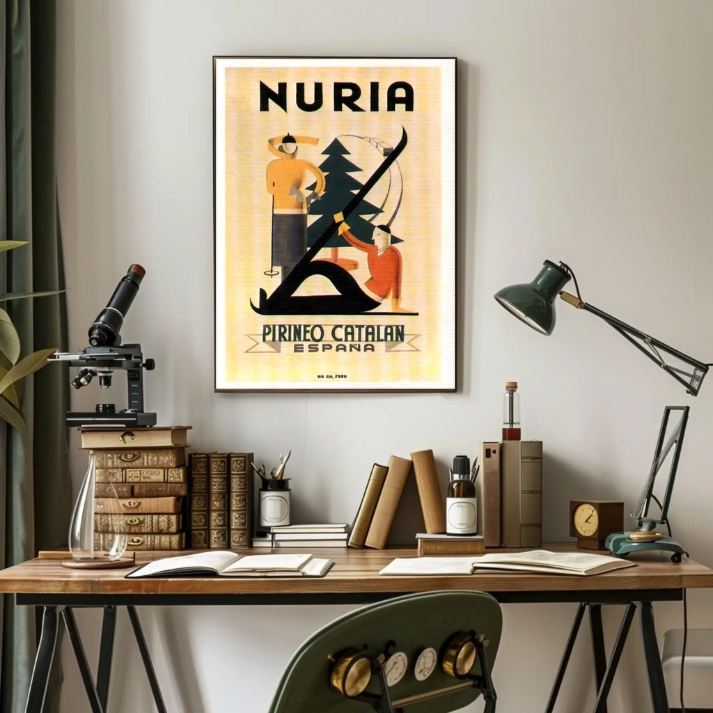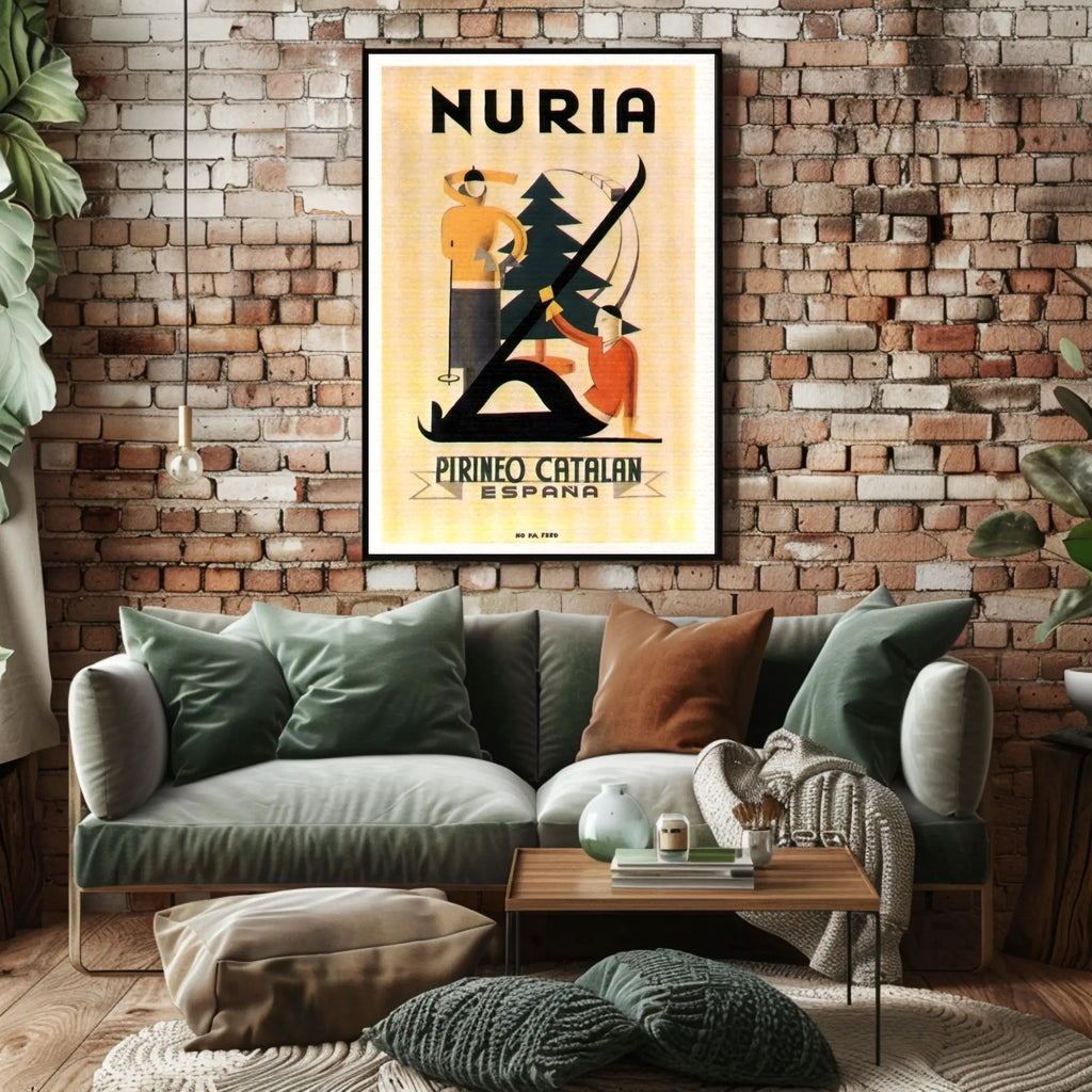 This art print features bold, geometric figures, a stylized pine tree and a dramatic diagonal ski motif set against a warm, softly textured background—evoking classic 20th-century poster design. Large, striking lettering reading “NURIA” and “PIRINEO CATALAN · ESPAÑA” anchors the composition, making it an eye-catching focal point for any wall.