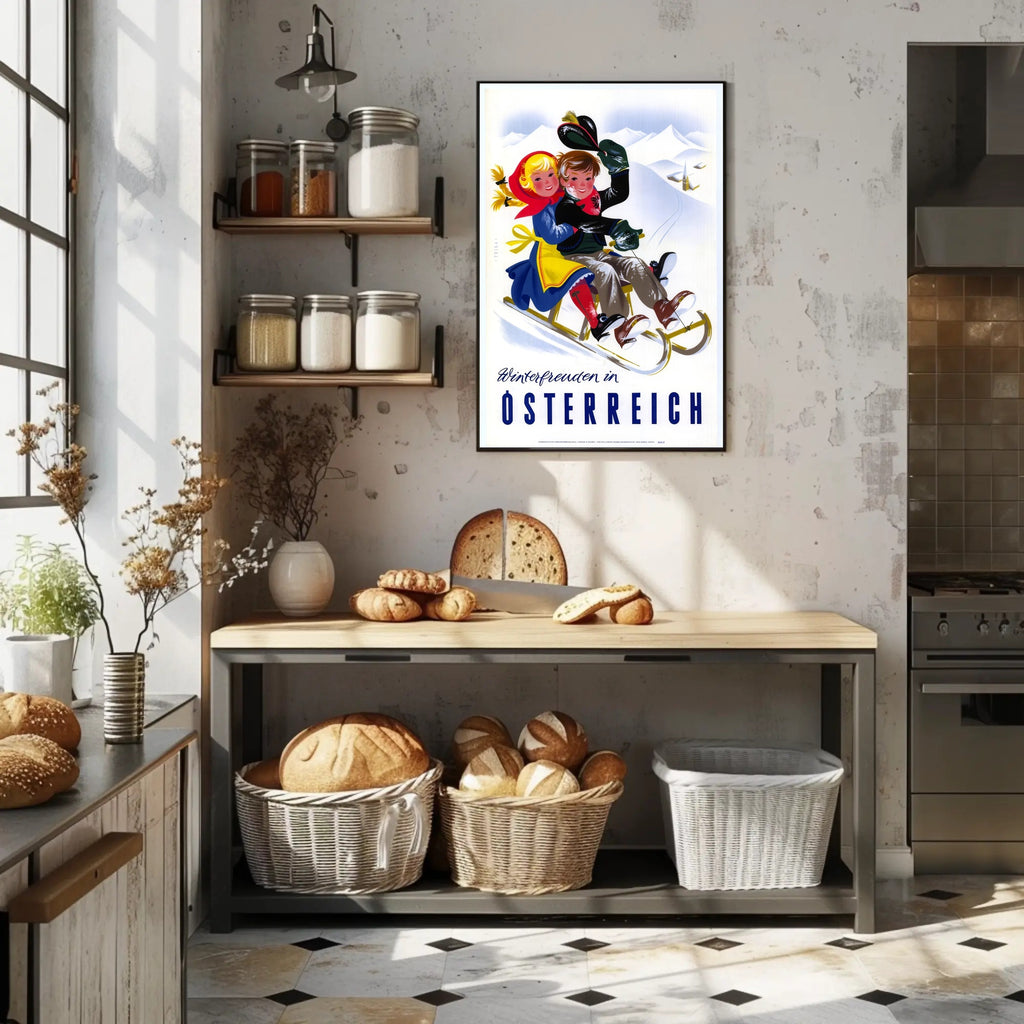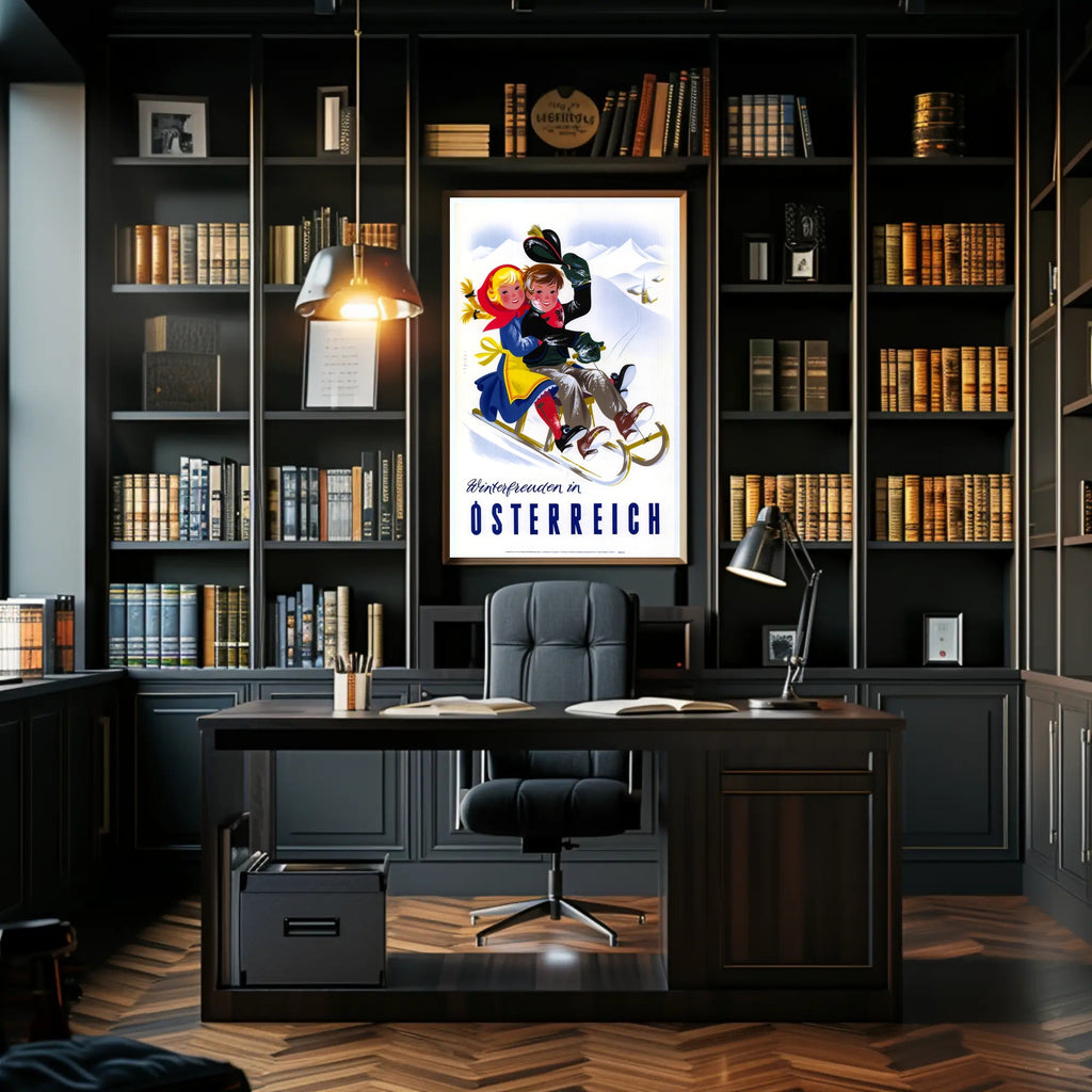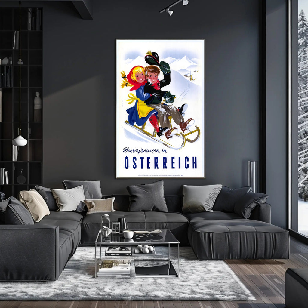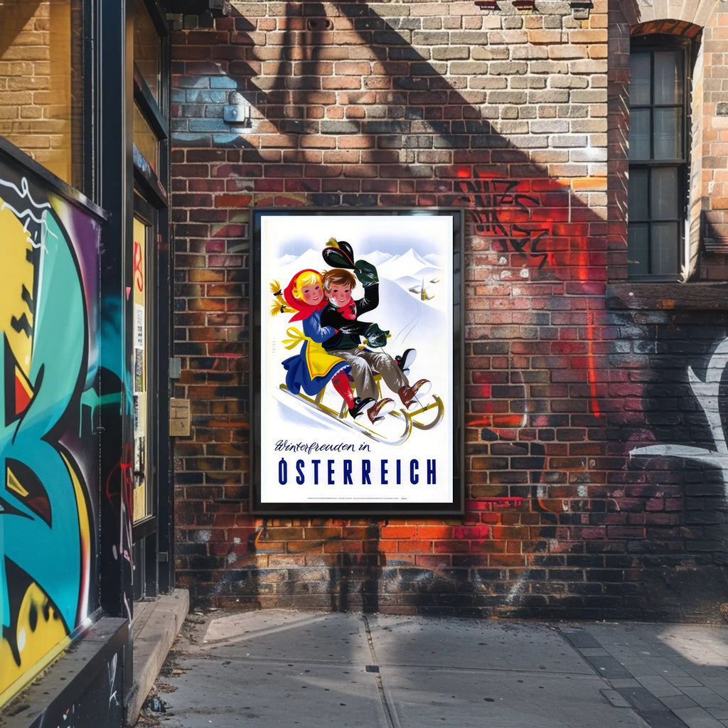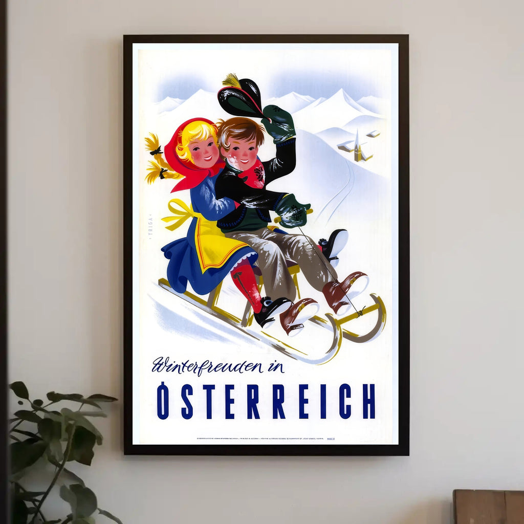 Dive into the enchanting world of vintage winter fun with this captivating poster featuring "Winterfreuden in Österreich." Set against the majestic snowy mountains of Austria, two joy-filled children sled down a slope, their colorful attire adding vibrancy to the scene. The nostalgia-infused illustration captures the playful essence of winter activities, evoking a festive spirit and the excitement of snowy adventures. Perfect for adding a touch of cheerful elegance to any space, this poster beautifully celebrates the charm and allure of winter sports in Austria with its bright colors and lively composition.