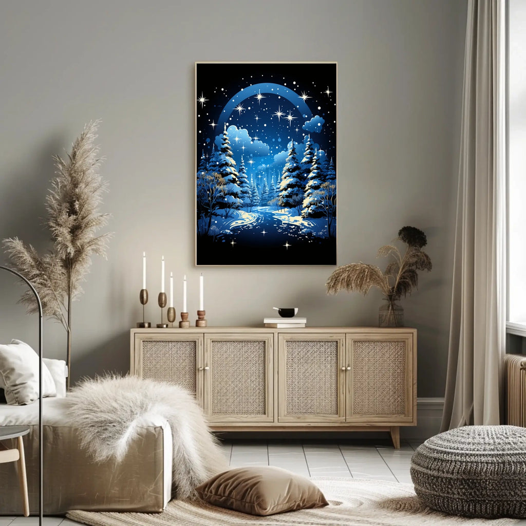 Experience the enchanting beauty of a winter night captured in this stunning fantasy art piece. The poster presents a serene winter wonderland set in a snowy forest under a starry sky. Snow-laden evergreen trees create a captivating pathway that invites viewers to explore the tranquil depths of the scene. Vibrant blues and whites are skillfully used to enhance the enchanting, modern art style, evoking a sense of peace and magic.