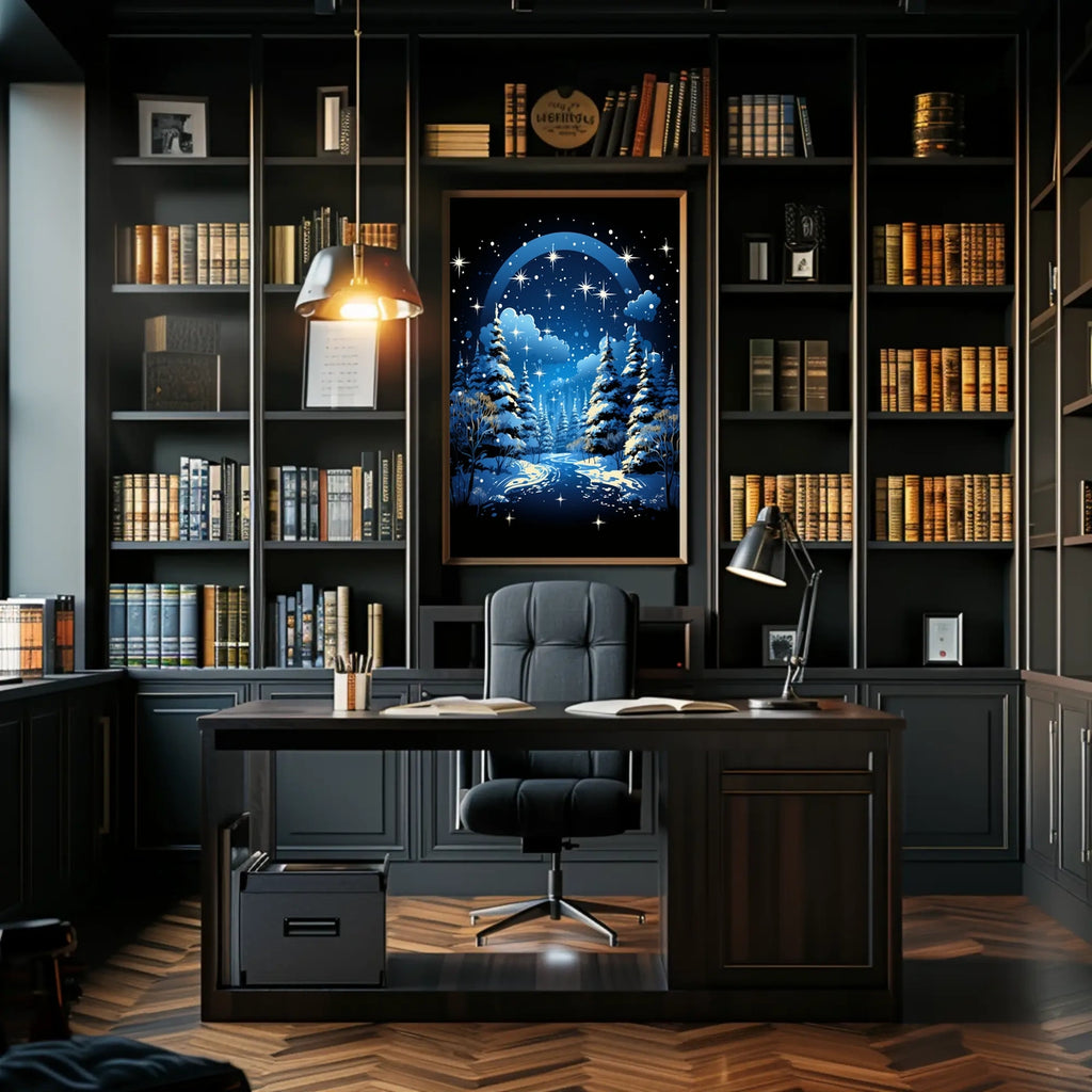 Whether you’re decorating a cozy living space, a creative studio, or a tranquil classroom, this enchanting poster brings a serene atmosphere with vibrant blue and white tones, capturing a magical night in a snowy forest. It’s the perfect addition to modern art collections and fantasy art displays, offering a touch of winter charm and dreamlike allure to any space.