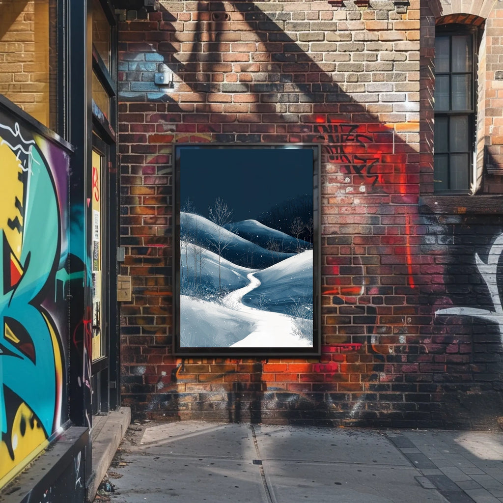 Transform your space with this captivating Winter Night Serenity: Minimalist Landscape Art Poster, a serene winter landscape crafted to inspire calm and contemplation. The artwork features rolling hills gently draped in snow beneath a vast, starry sky. A winding path meanders through the scene, flanked by bare trees adorned with delicate, snow-frosted branches. Crafted in a modern, minimalist style, the piece employs a cool palette of blues and whites, evoking tranquil evenings and quiet reflection. This peaceful and contemplative depiction of a winter night beautifully captures the serene beauty of the season, making it a perfect addition to any home or office.
