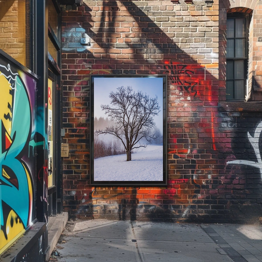 Winter Serenity: Minimalist Artistic Poster invites you to immerse yourself in the tranquil beauty of winter. Featuring a captivating winter landscape, the central subject is a striking bare tree, its branches gracefully extending against a delicate snowy backdrop. The subtle interplay of photography and graphic elements creates a serene, ethereal setting, enhanced by a misty atmosphere and a distant forest. The carefully chosen monochrome palette of whites, grays, and soft blues accentuates the chilly ambiance, evoking feelings of calmness and solitude. Ideal for those seeking a piece of natural beauty, this poster embodies the essence of winter's serene isolation.