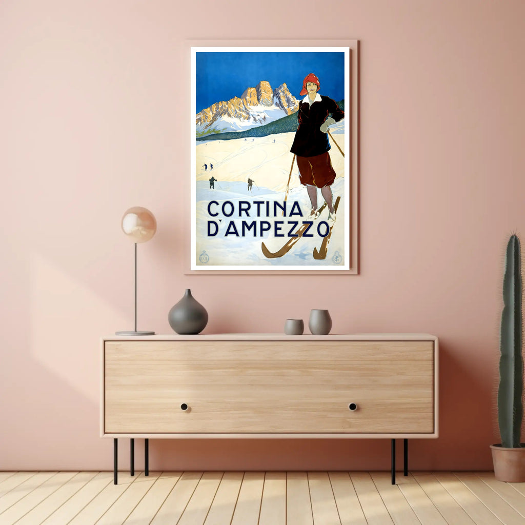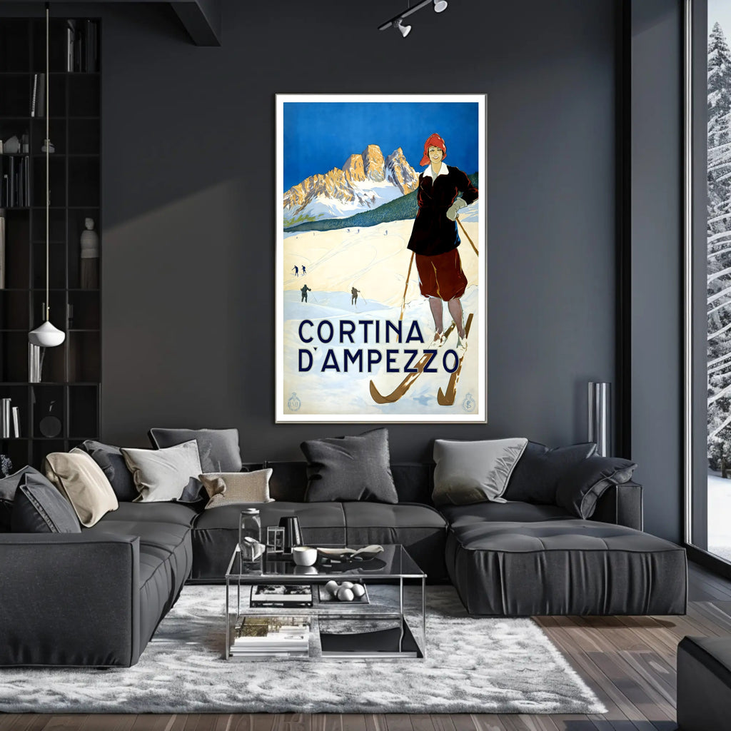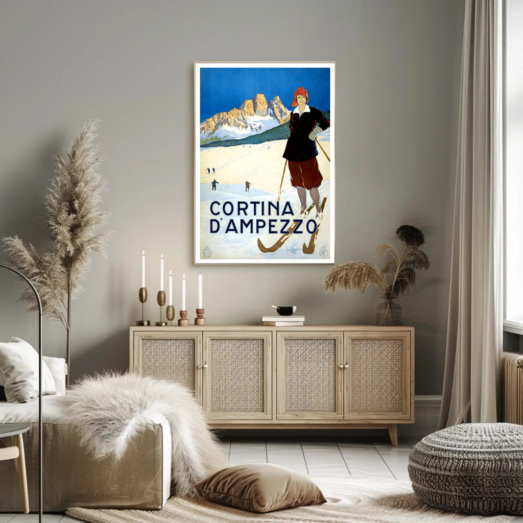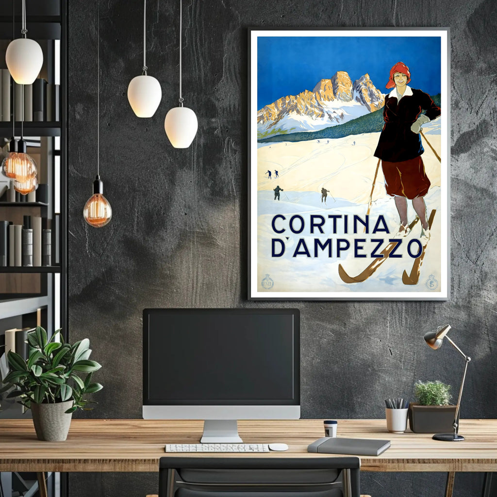 Bring the timeless charm of the Dolomites into your home with the Winter Sports in Cortina d'Ampezzo Poster by PosterGoat. This vintage-inspired art print showcases a confident skier in period attire, crisp snowfields, and sunlit mountain peaks under a striking cobalt sky — a scene that captures the romance of winter travel and classic alpine sport.