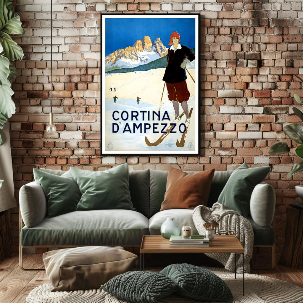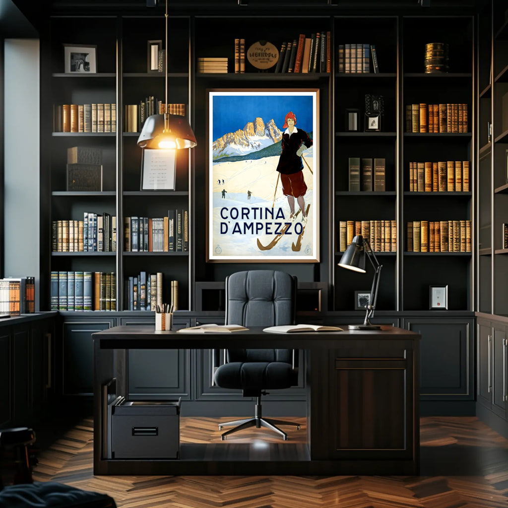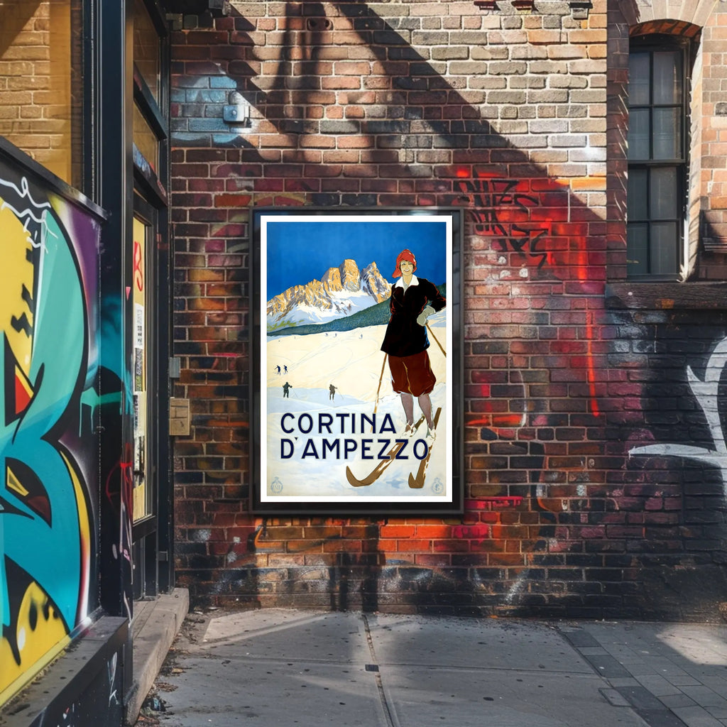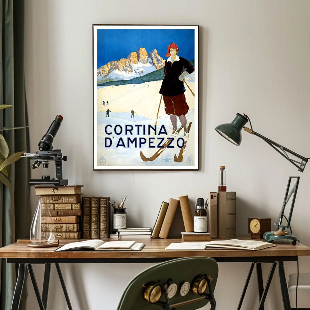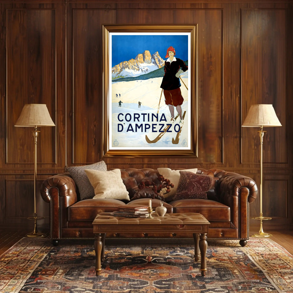 Bring the timeless charm of the Dolomites into your home with the Winter Sports in Cortina d'Ampezzo Poster by PosterGoat. This vintage-inspired art print showcases a confident skier in period attire, crisp snowfields, and sunlit mountain peaks under a striking cobalt sky — a scene that captures the romance of winter travel and classic alpine sport.