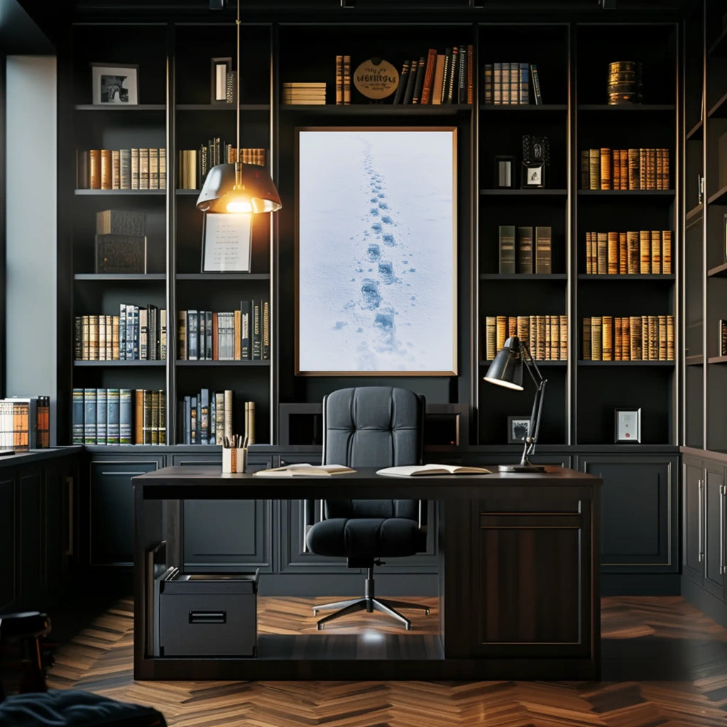Step into a tranquil winter landscape with this photorealistic poster, capturing the serenity of untouched wilderness blanketed in snow. A singular track of footprints winds its way through the scene, evoking exploration and solitude beneath soft, natural lighting. The minimalistic beauty of the snow-covered terrain creates a calm and contemplative mood, making this piece a perfect addition for nature lovers, art enthusiasts, and anyone who appreciates quiet storytelling through imagery.