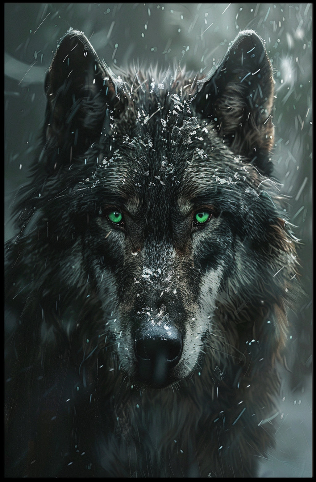 Stunning visual impact: Hyper-detailed wolf face with luminous green eyes and lifelike snow accents that draw the viewer in.
