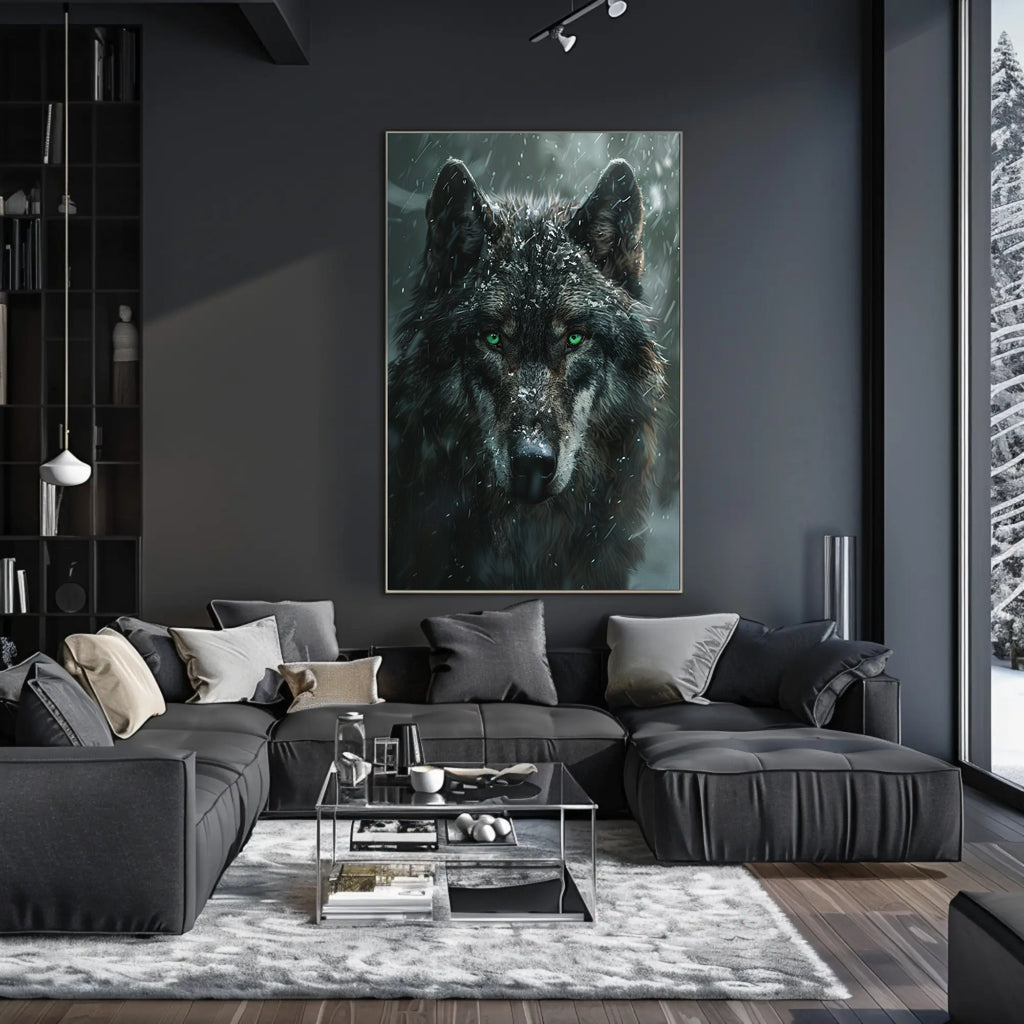 Bring the raw power of the wilderness into your home with the Winter Wolf Poster from PosterGoat. This striking, high-contrast poster features a close-up portrait of a majestic wolf framed by falling snow — vivid green eyes, textured fur dusted with ice crystals, and a moody winter palette combine to create an unforgettable focal point for any room.