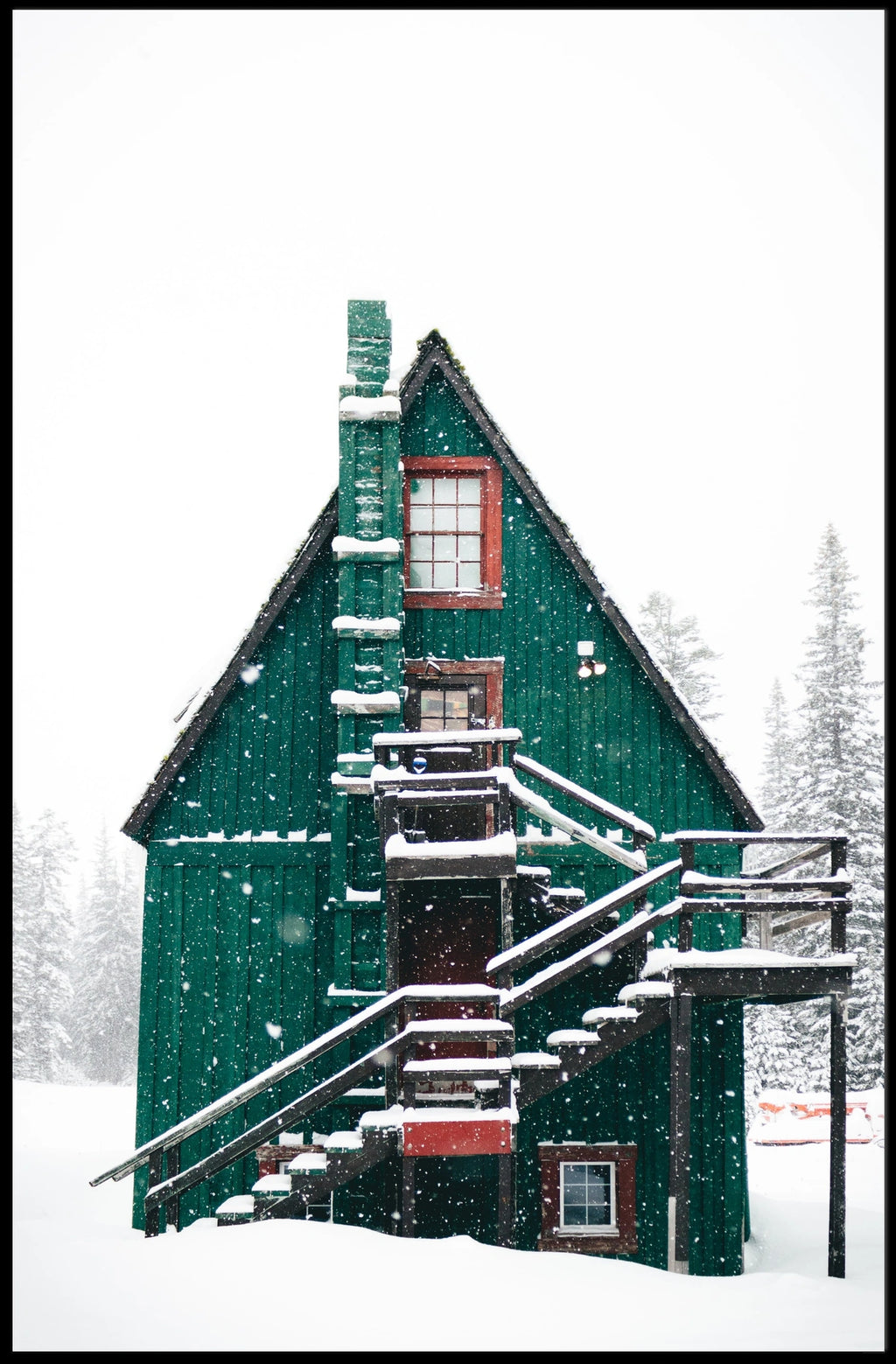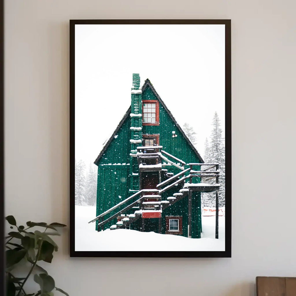 Winter Wonderland Cabin in National Park Poster celebrates the serene beauty of a snow-covered cabin nestled in a winter landscape. The cabin's green facade and red trim stand as a charming focal point amidst falling snow and towering evergreen trees. Set against a tranquil, forested national park backdrop, this piece evokes solitude, warmth, and rustic charm—an ideal accent for any room seeking cozy winter vibes. Its serene imagery invites you to imagine yourself wrapped in nature's quiet embrace.