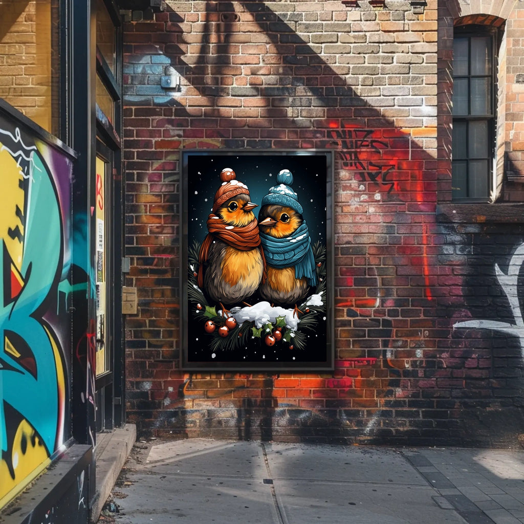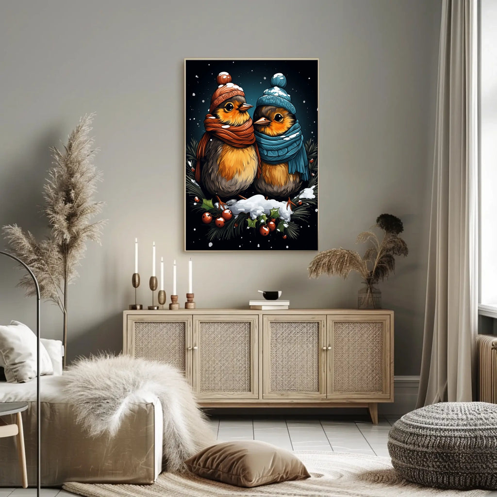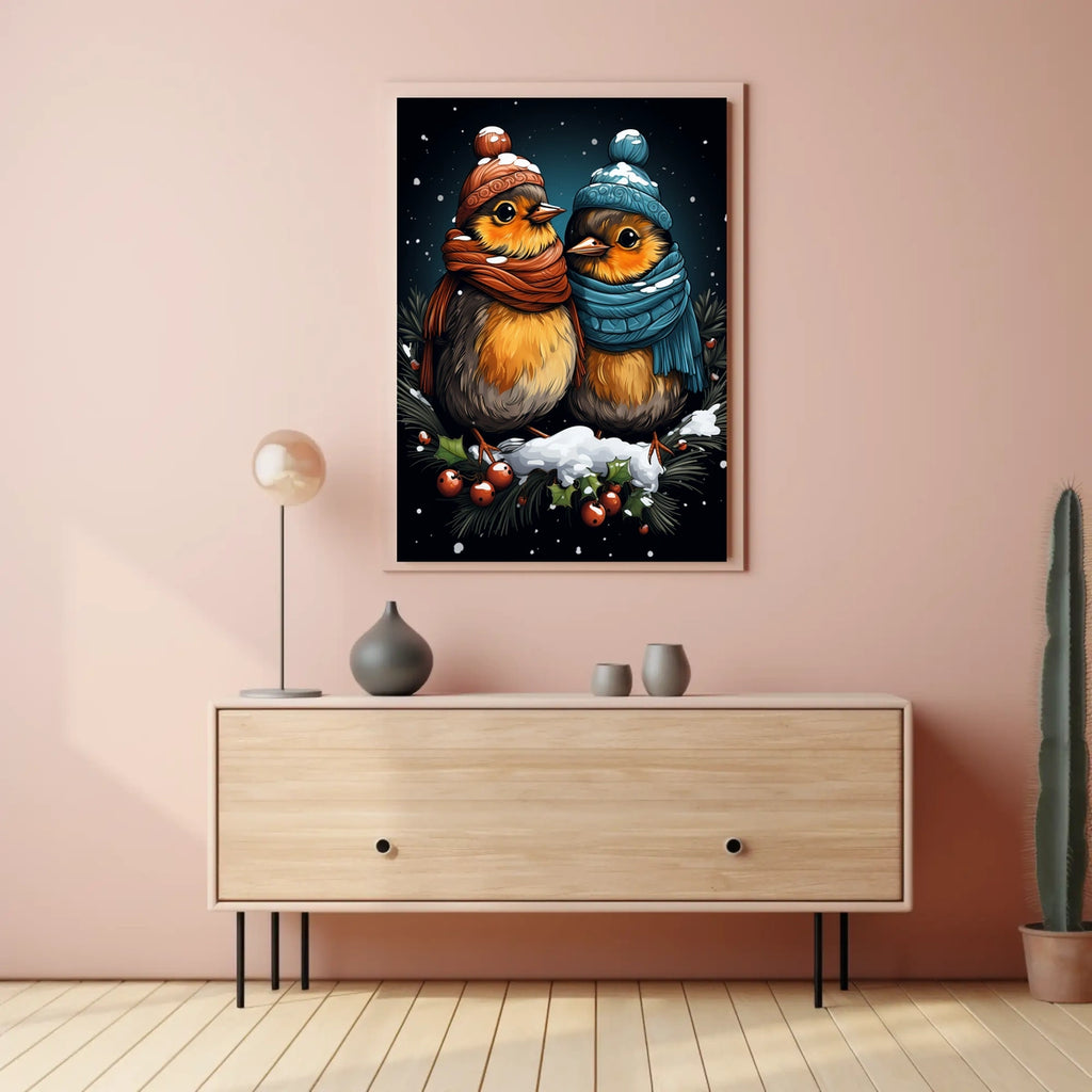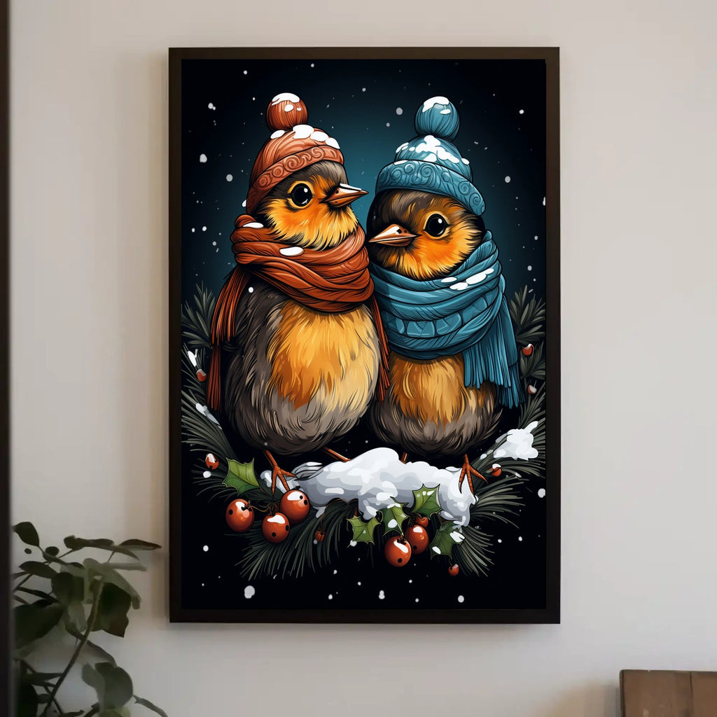 Celebrate the cozy charm of winter with this delightful illustration of two birds nestled on a snowy branch. Dressed in colorful knit hats and scarves, they bring warmth, whimsy, and holiday charm to any room.