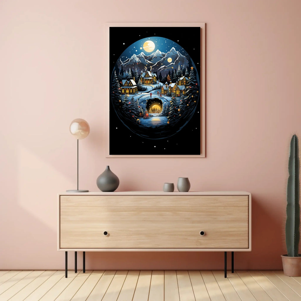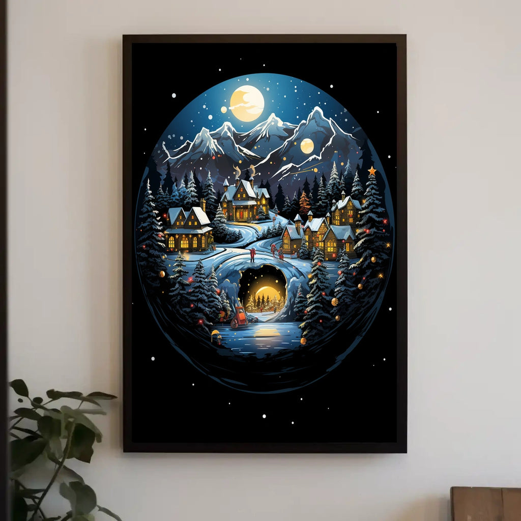 This captivating poster showcases a magical winter village scene enveloped in tranquility. Snow-draped houses glow warmly against the backdrop of a majestic mountain range under a star-studded sky with a luminous full moon. Pine trees, festively decorated, frame the village, imparting a holiday theme. A frozen river winds through the serene landscape, casting delicate reflections of light. The whimsical, illustrative art style conjures a cozy and nostalgic atmosphere, reflecting the essence of a winter wonderland during the holiday season. This enchanting design is ideal for holiday décor or wintry product collections.