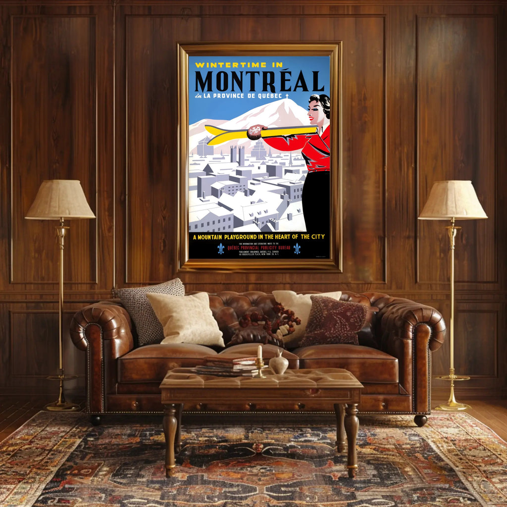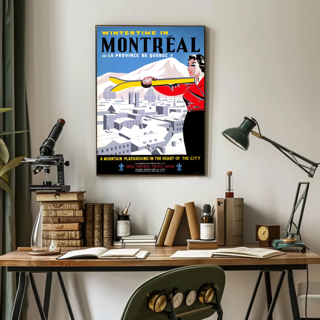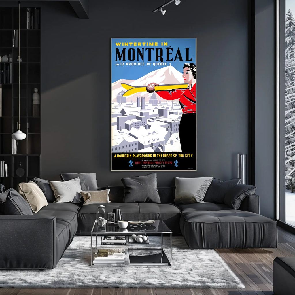 Bring vintage travel charm to your walls with the Wintertime in Montréal Poster from PosterGoat — a striking art poster that celebrates Montréal's snowy skyline and mountain playgrounds in a bold, minimalist style.