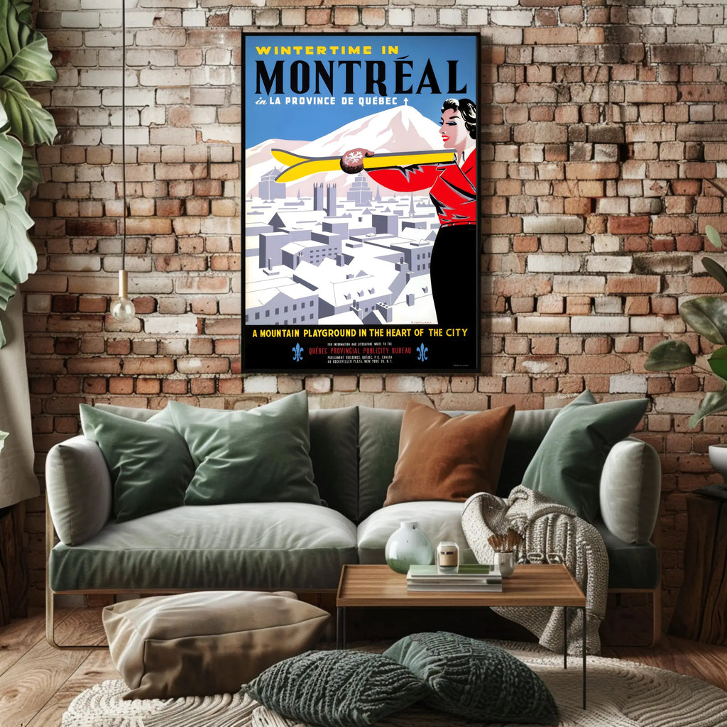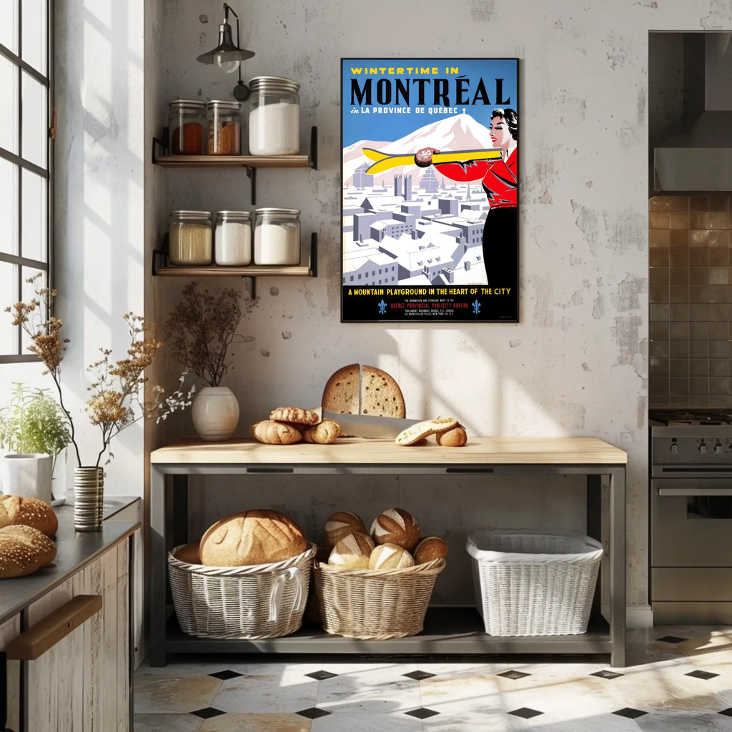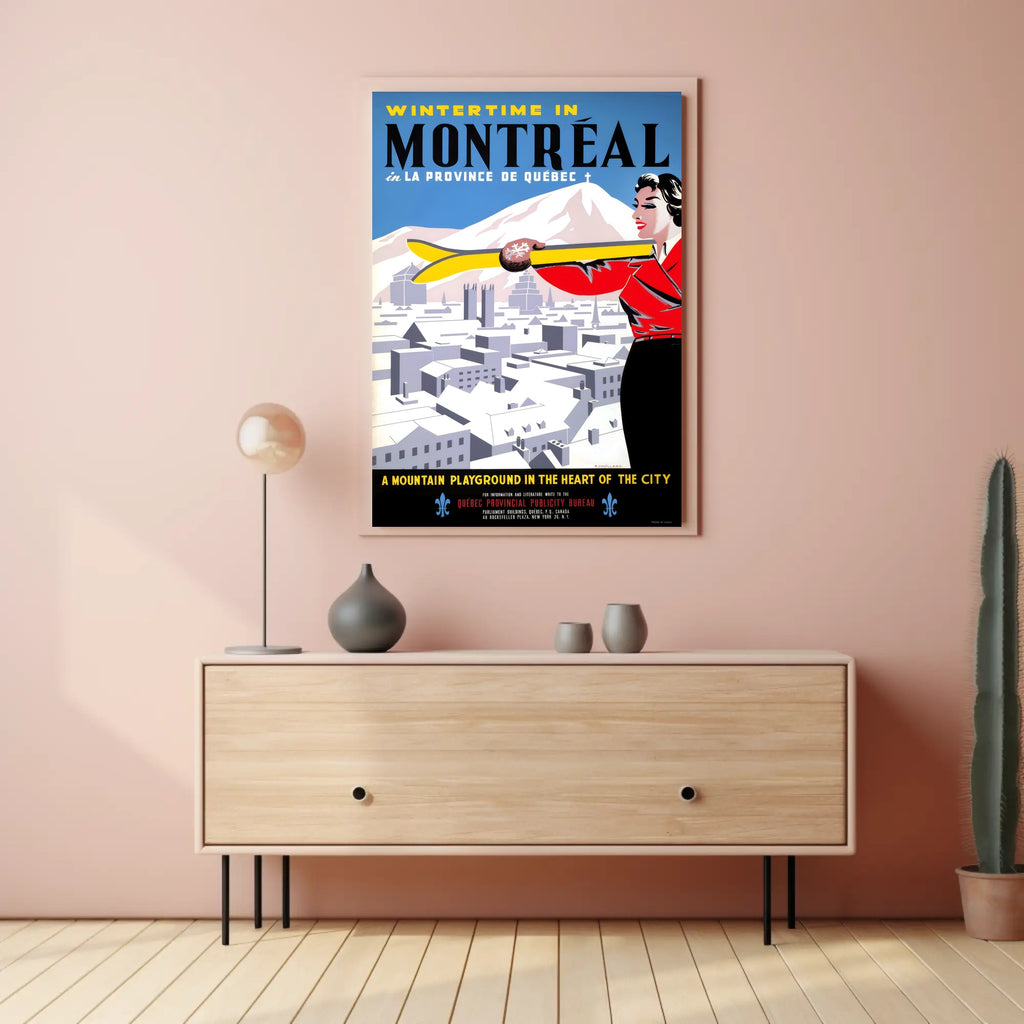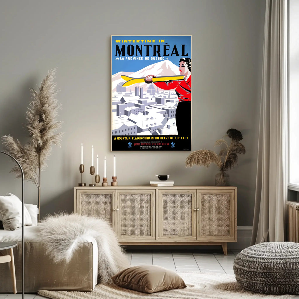 Bring vintage travel charm to your walls with the Wintertime in Montréal Poster from PosterGoat — a striking art poster that celebrates Montréal's snowy skyline and mountain playgrounds in a bold, minimalist style.