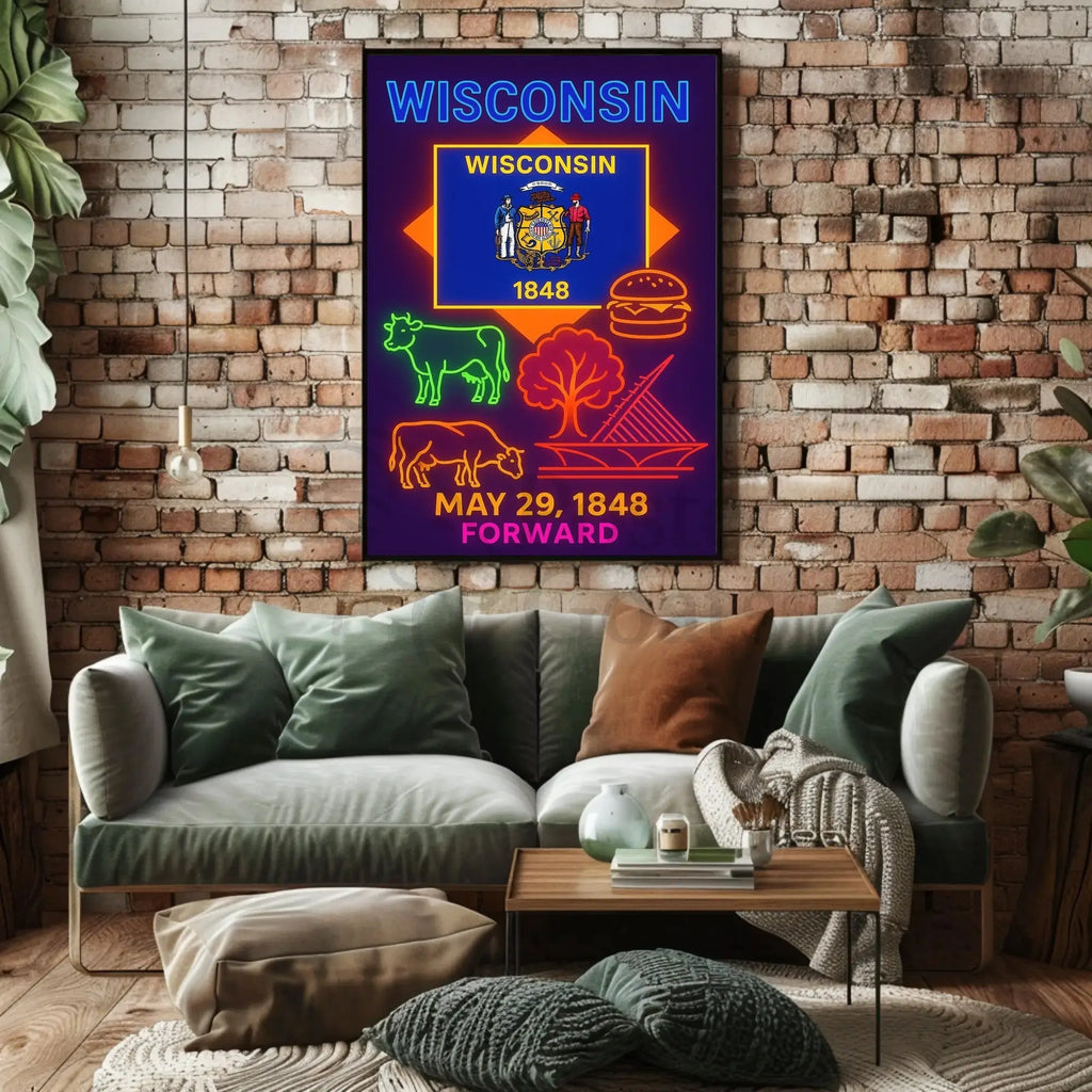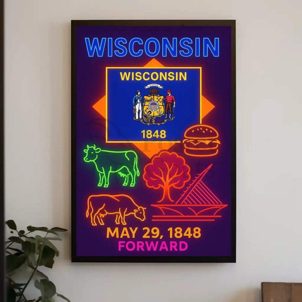 Bring bold, nostalgic energy to your walls with the Wisconsin Neon Culture Poster by PosterGoat — an electrifying pop-art print that blends state pride with modern neon aesthetics. Vivid neon outlines, the unmistakable Wisconsin state flag and emblem, and playful icons representing Wisconsin’s culinary and agricultural heritage come together in a mid-century modern / vaporwave composition that leaps off any room.