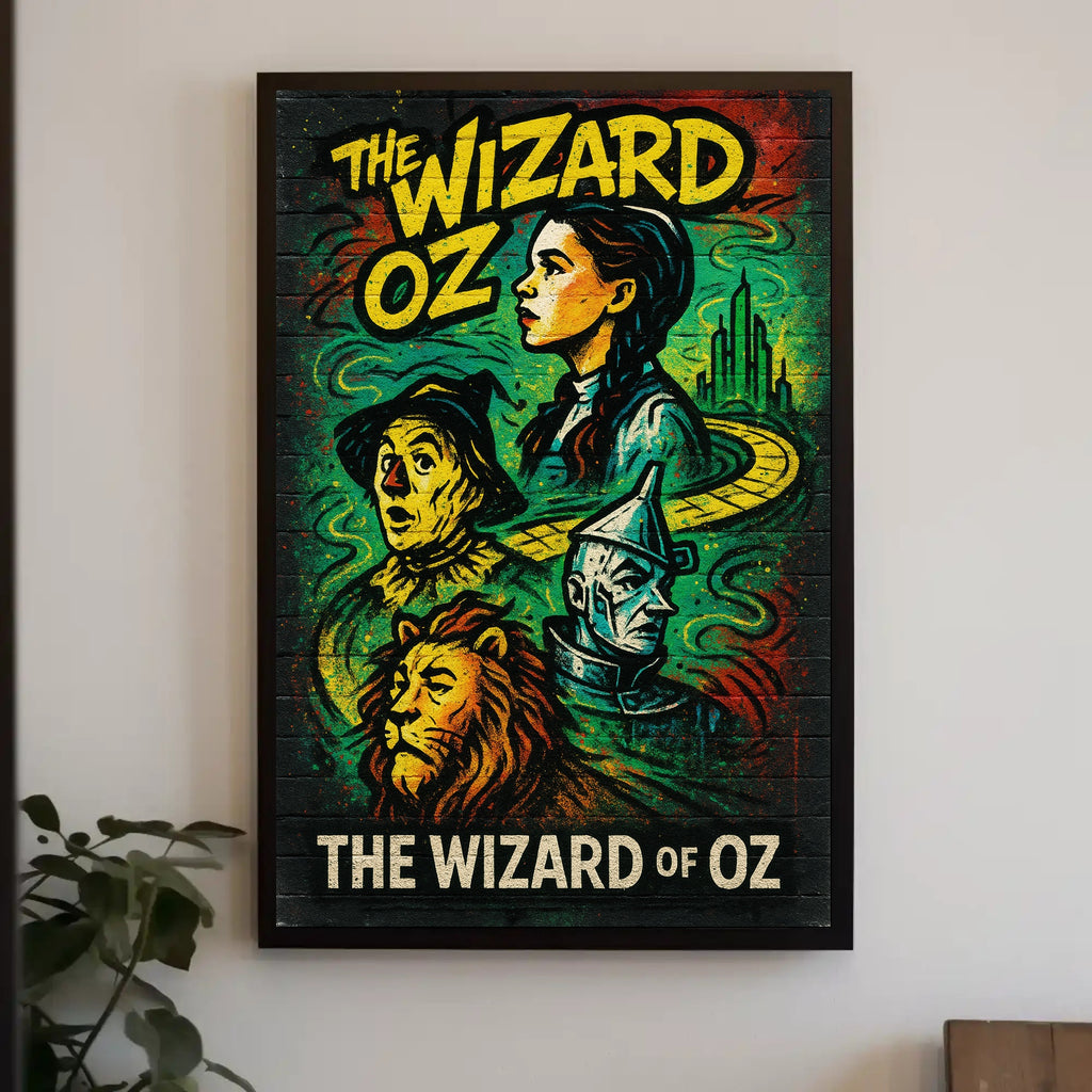 Bring the timeless magic of Oz into your home with the "Wizard of Oz Whimsical Journey" poster from PosterGoat. This collectible art print reimagines Dorothy and her iconic companions in a bold, vintage-modern illustration — rich emerald greens, sunlit yellows and dramatic reds swirl across a textured brick-and-wood backdrop to recreate the Yellow Brick Road and the distant spires of the Emerald City.