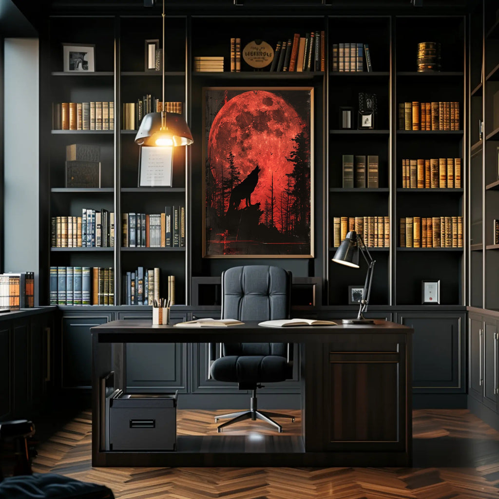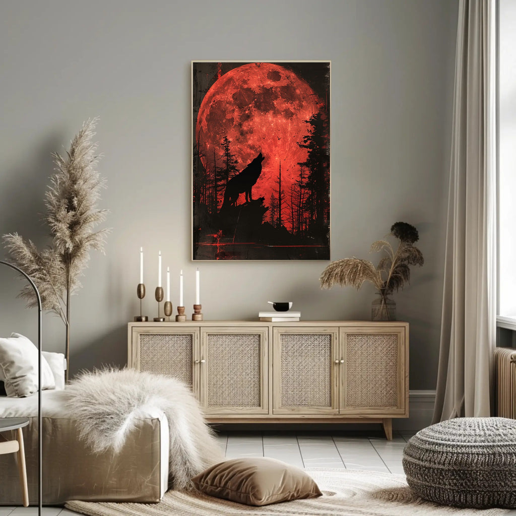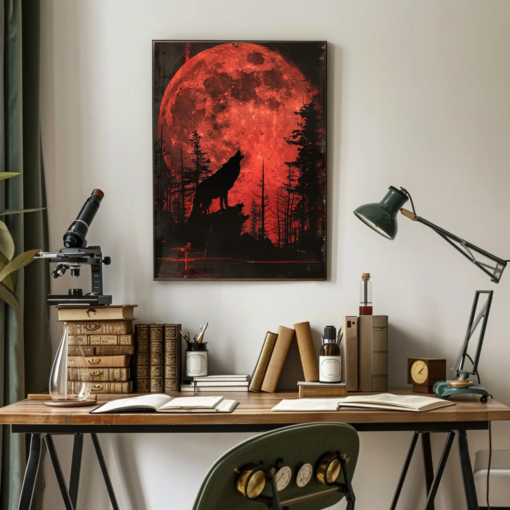 - Striking visual impact: A massive, vivid red moon fills the background while the silhouetted wolf and forest foreground deliver cinematic depth and atmosphere.