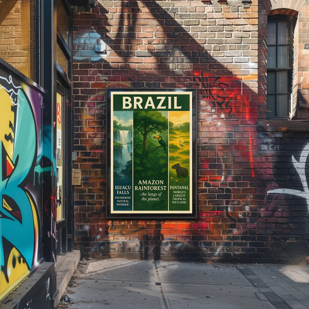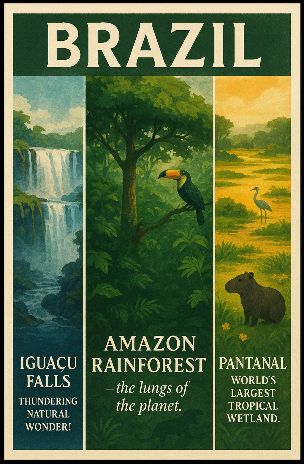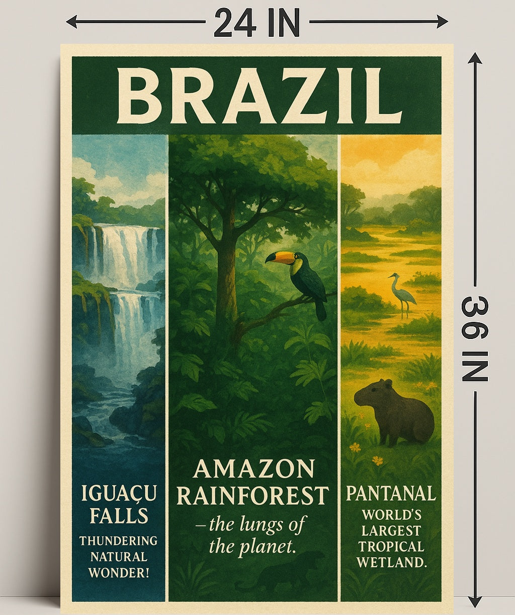 - Striking triptych layout: Three vertically aligned panels highlight Brazil’s most celebrated ecosystems—waterfall, jungle, and wetland—for immediate visual impact.