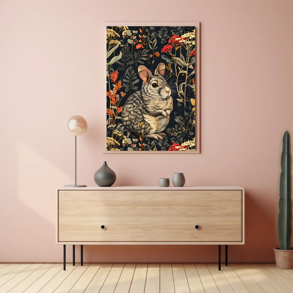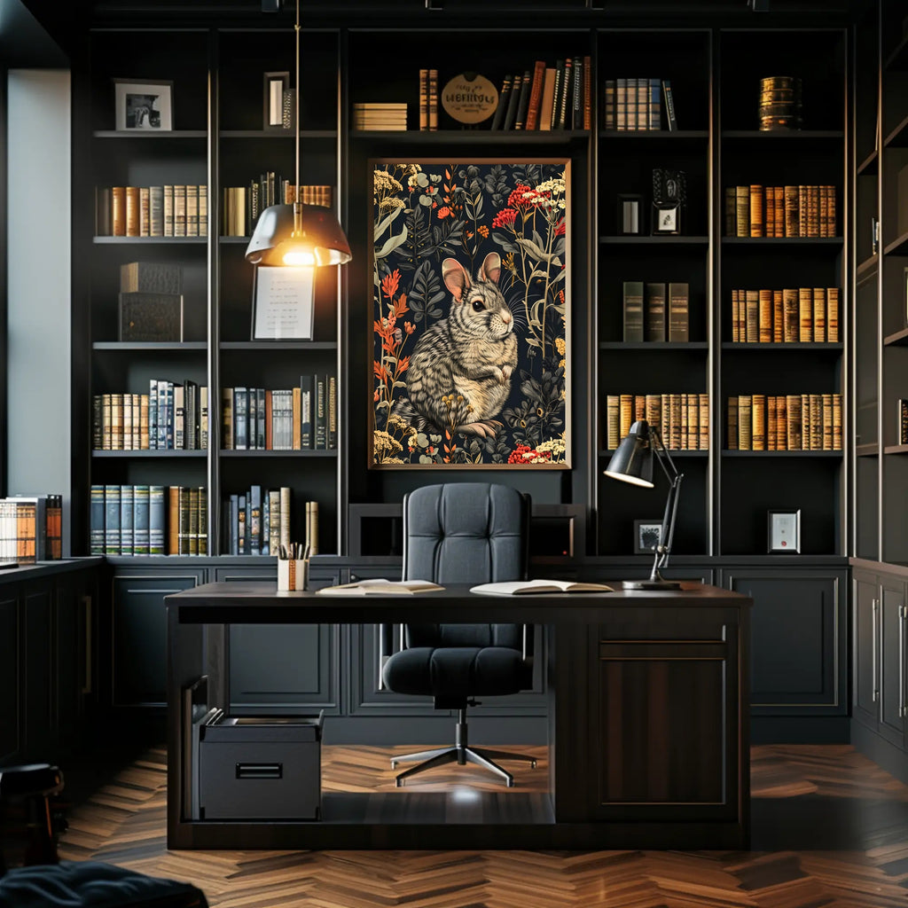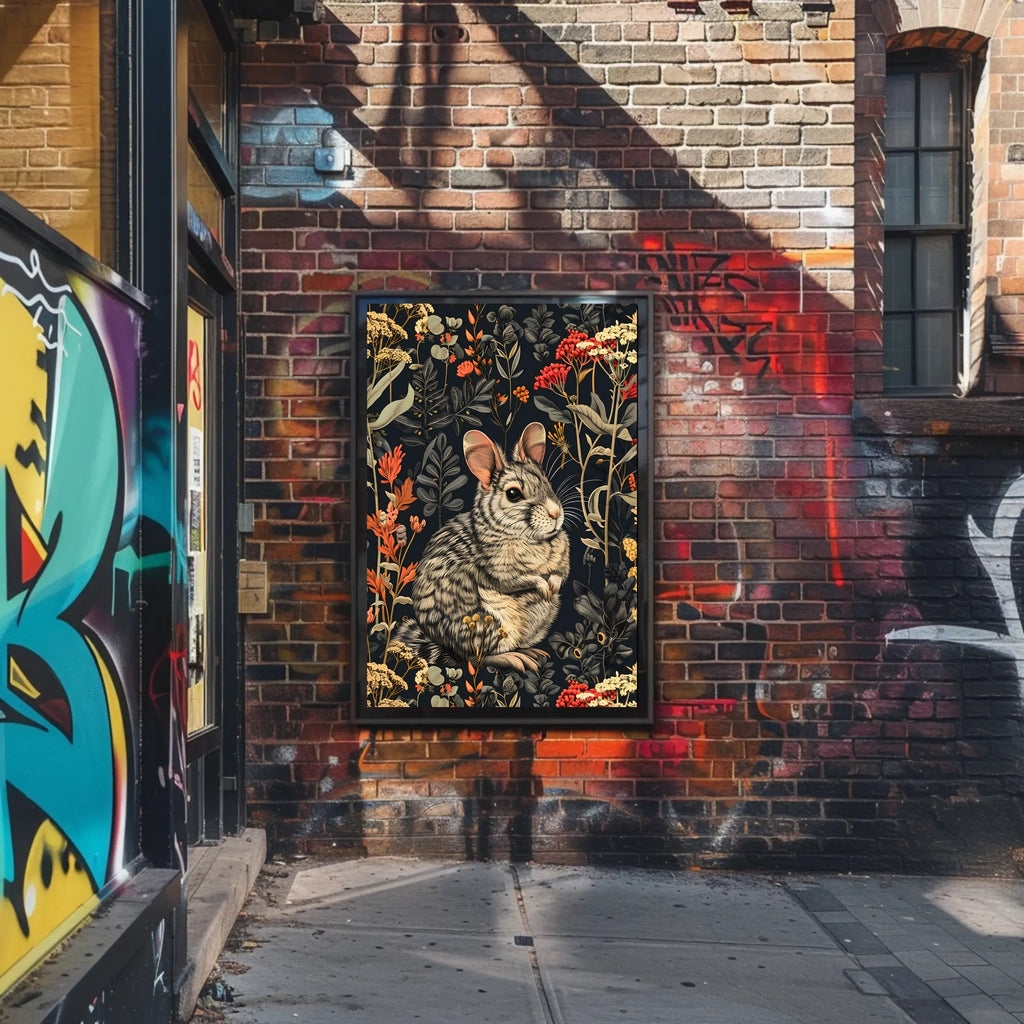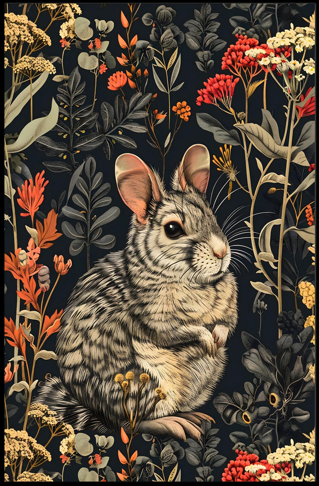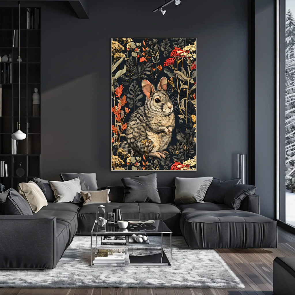 Why it stands out: This striking print features an intricately illustrated woodland creature nestled among elegant wildflowers and foliage. The deep, moody background creates dramatic contrast while warm coral, gold, and cream accents give the composition a refined, scenic warmth that complements modern and rustic interiors alike.
