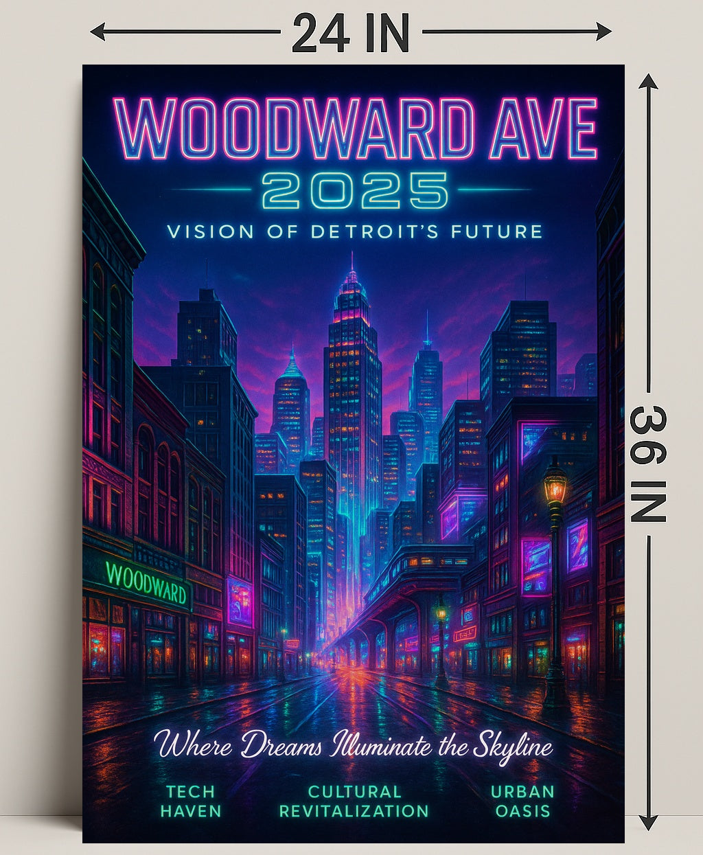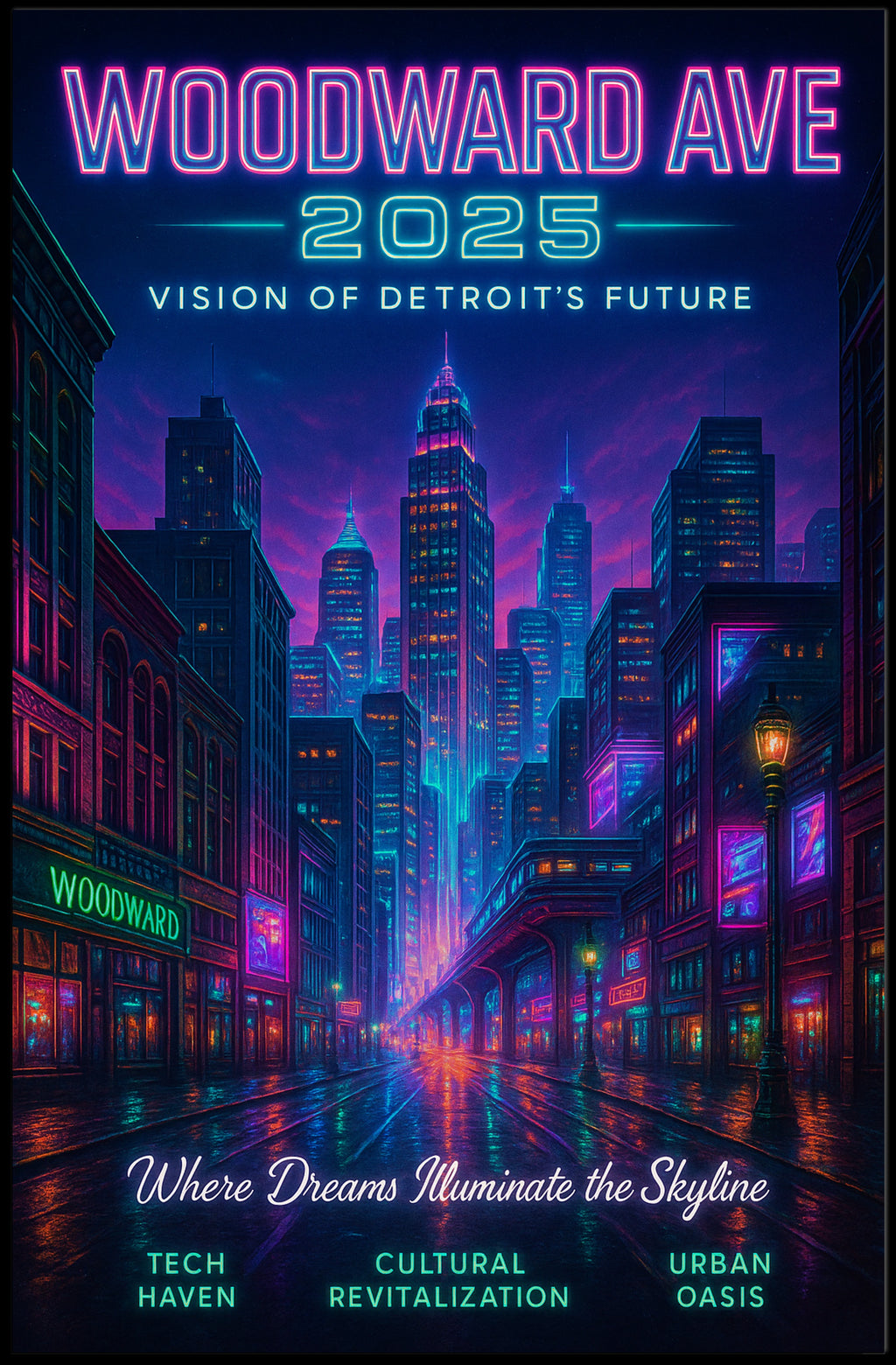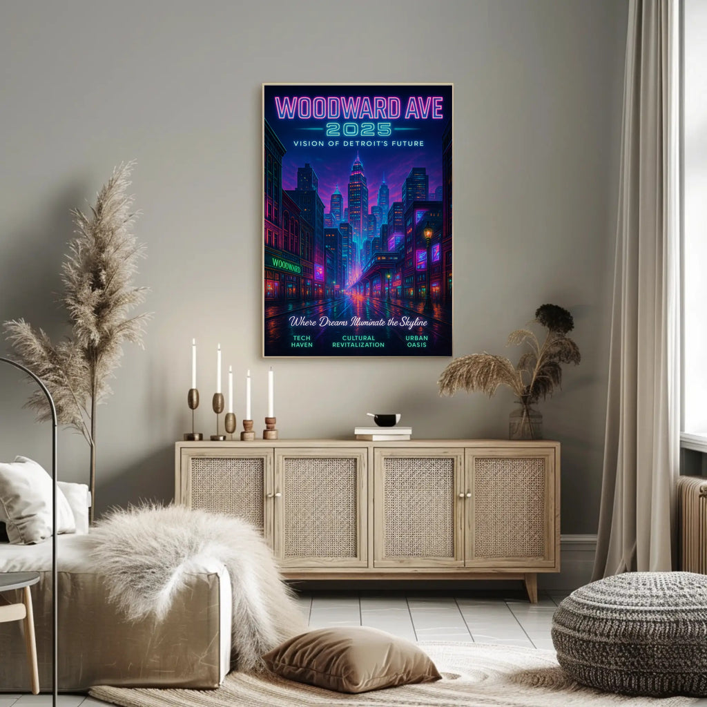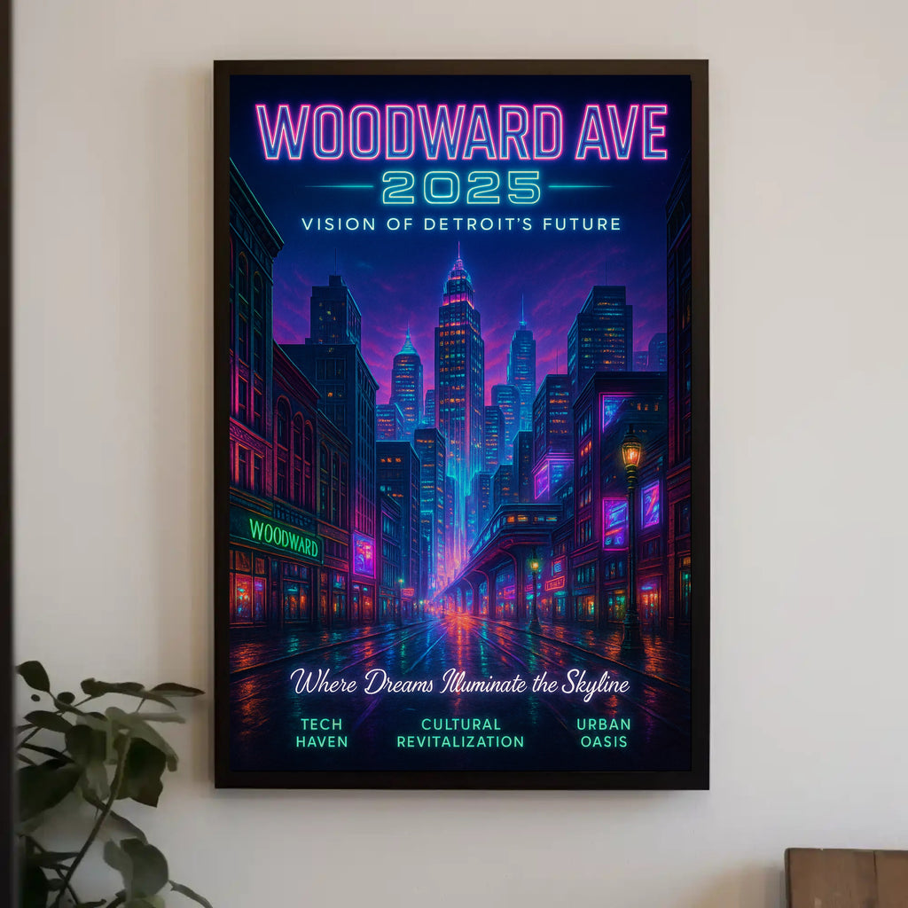 Woodward Ave 2025 — Vision of Detroit's Future from PosterGoat brings a neon-lit, minimalist vision of urban renewal to your walls. This striking poster blends retro-futuristic color with clean composition to celebrate Detroit's revival—perfect for Home & Garden decor, especially Posters, Prints, & Visual Artwork.