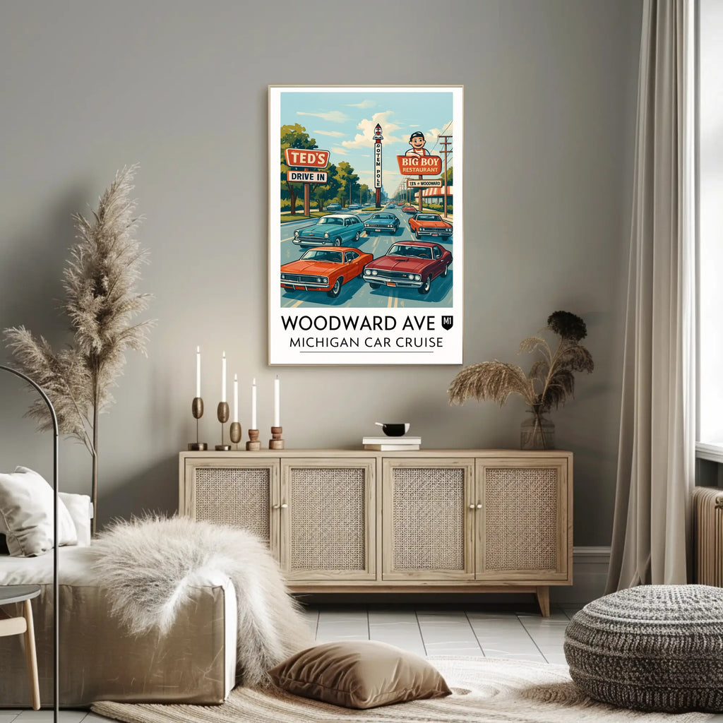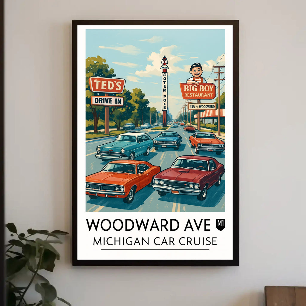 Immerse yourself in the rich nostalgia of mid-20th century Americana with this vibrant poster capturing the essence of the Woodward Ave Michigan Car Cruise. The illustration features vintage cars from the 1960s and 70s, vividly cruising past iconic landmarks like Ted's Drive-In and Big Boy Restaurant. A distinct totem pole stands proudly, adding a unique cultural touch to the scene. With its bold colors and clean lines, this lively depiction celebrates classic car culture and community spirit. Perfect for enthusiasts of automotive history and retro Americana, it's a piece that evokes cherished memories of a bygone era.