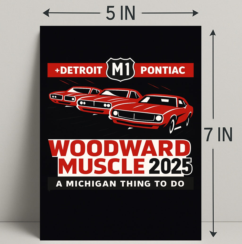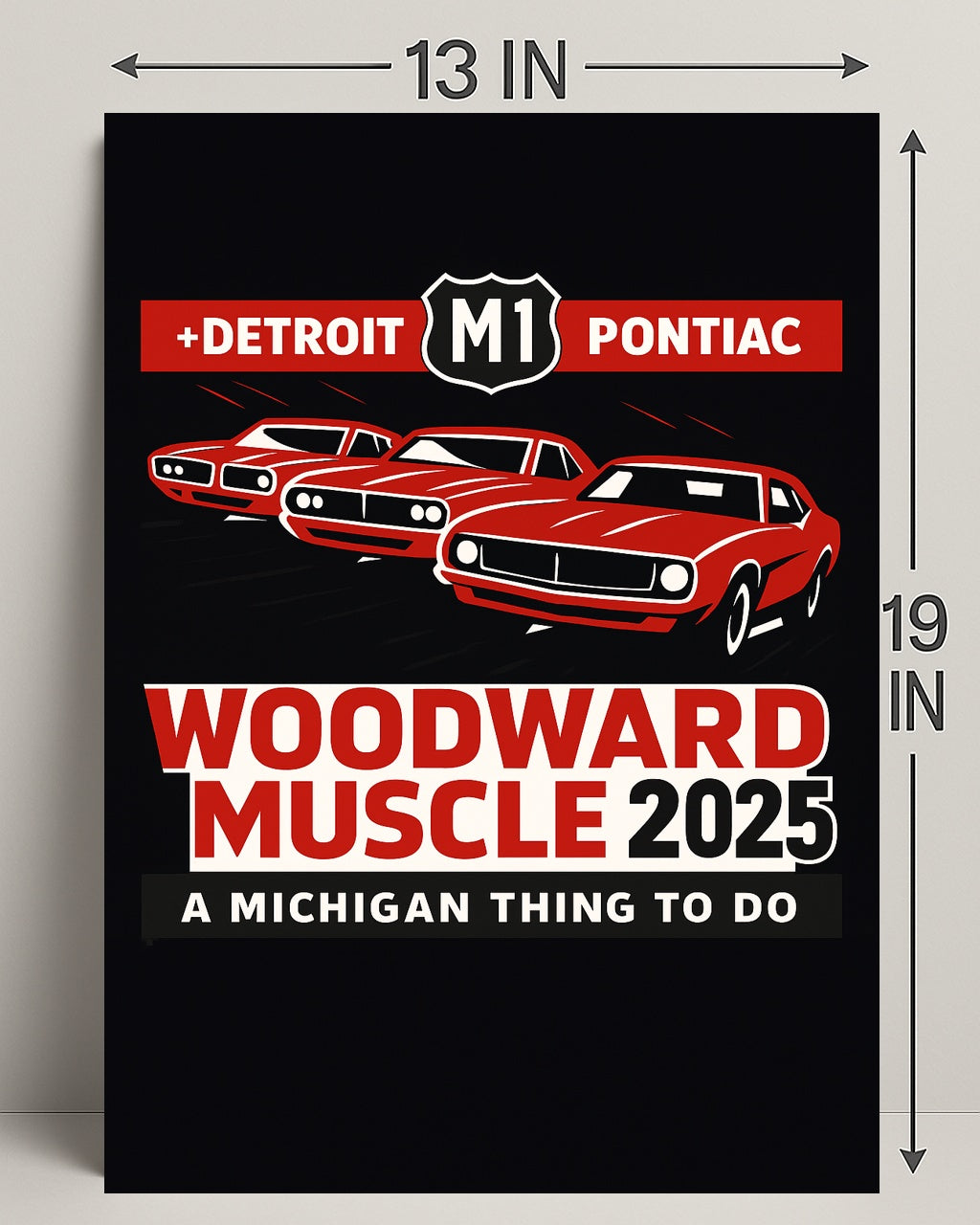 Event-forward messaging: Large bold typography reading “WOODWARD MUSCLE 2025” captures the excitement of automotive culture and makes this poster a collectible souvenir or gift for car lovers.